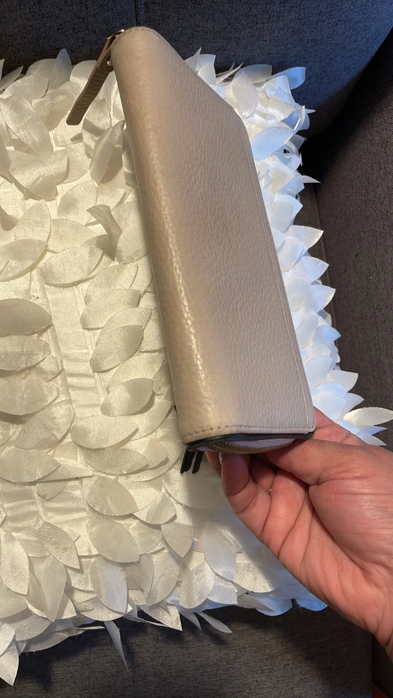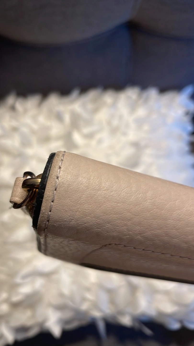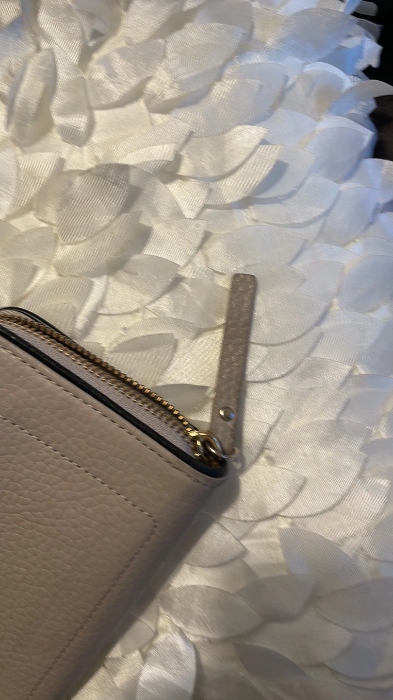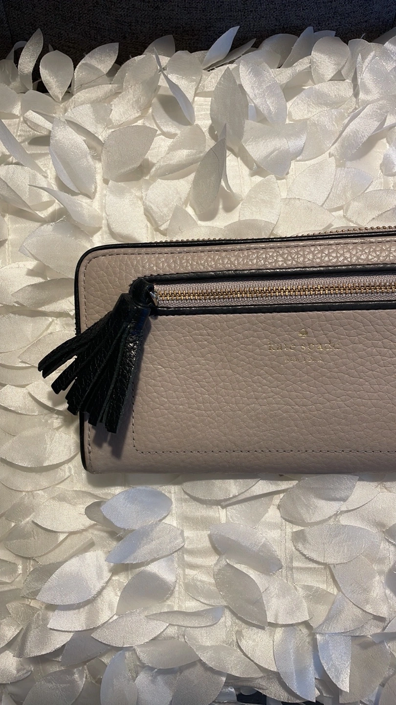 Pale pink leather zip around wallet. Features multiple card slots and compartments. Gold-toned hardware. Zip closure. ok condition