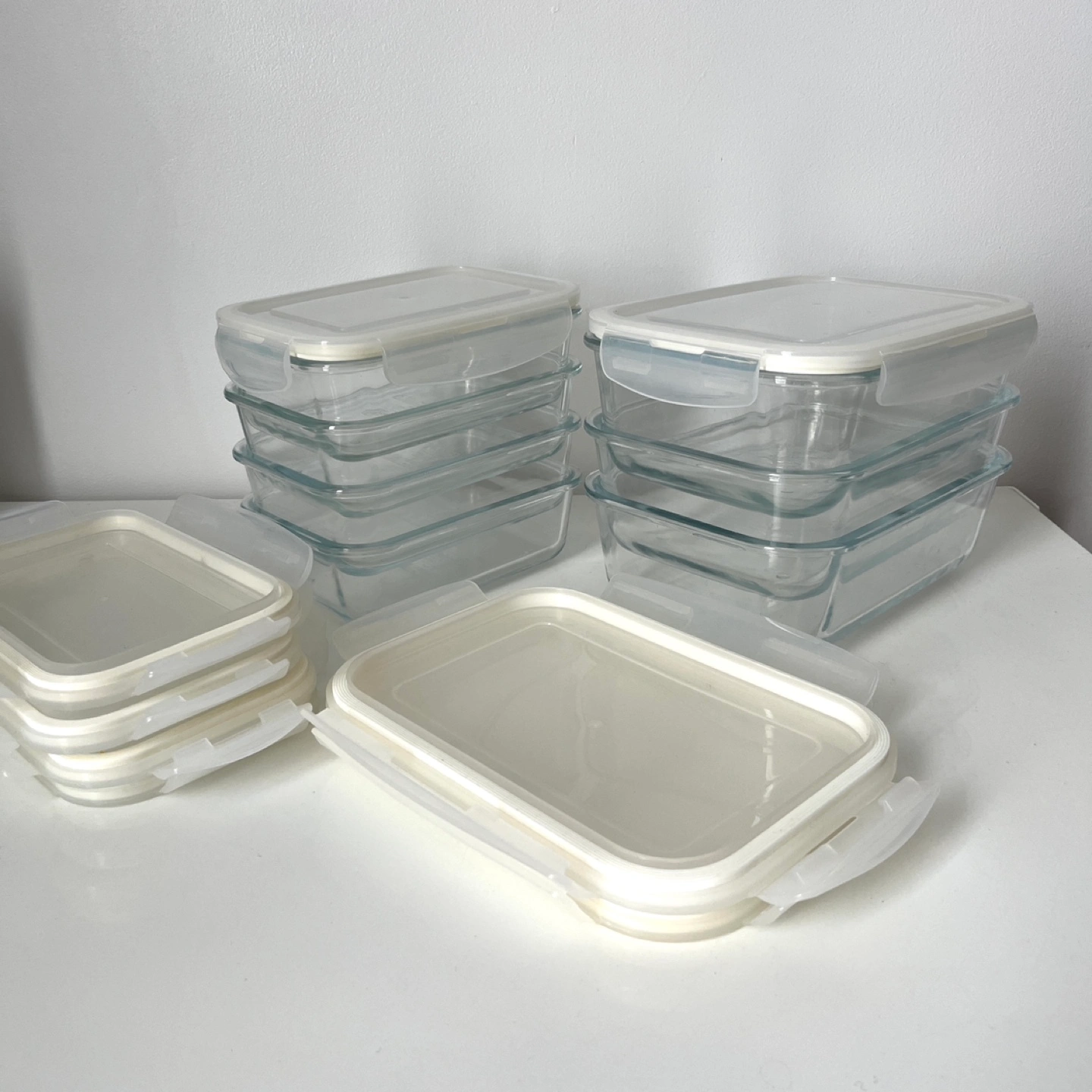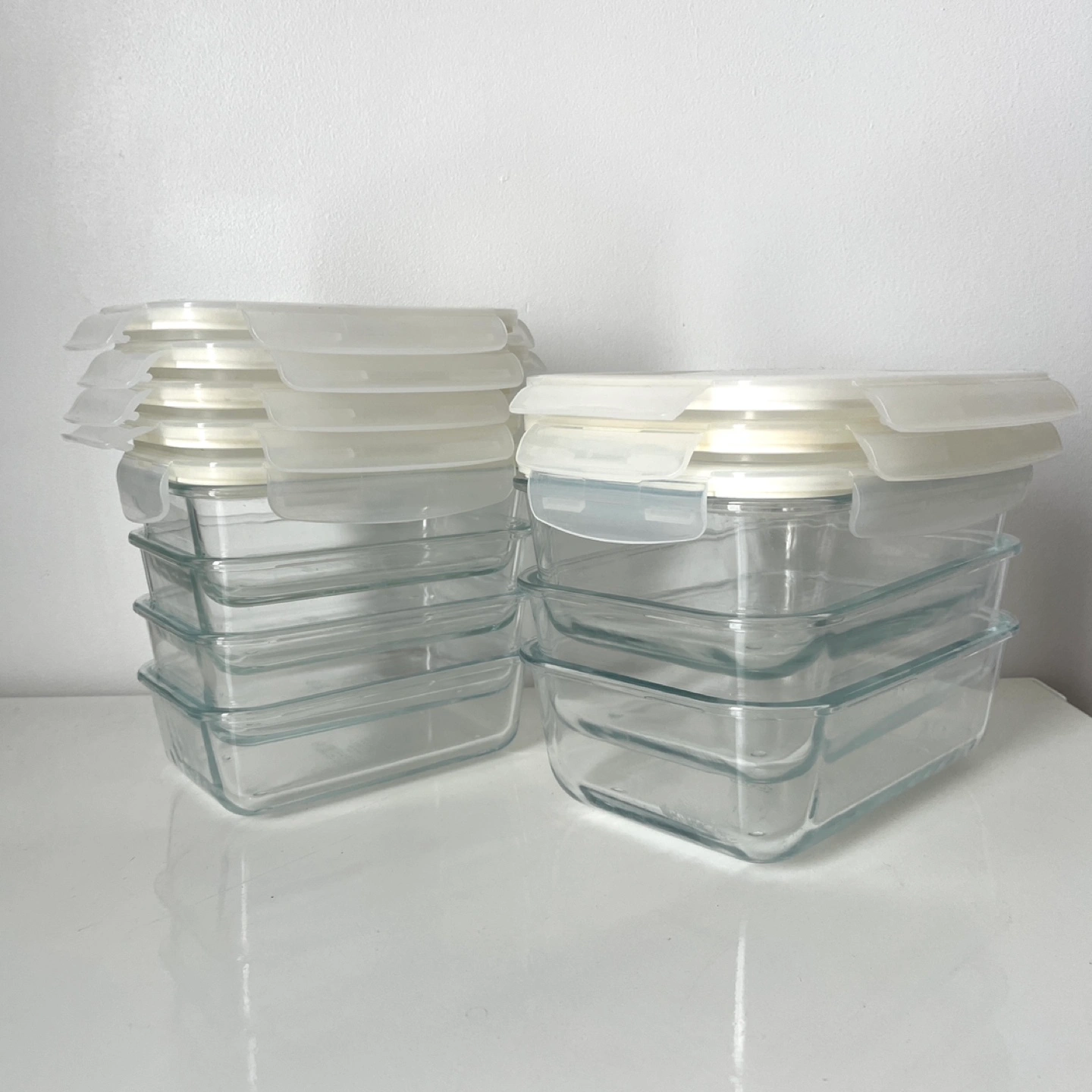 Set of seven IKEA 365+ glass food storage containers, includes lids. 2 sizes - 4 small, 3 large. Microwave, oven, freezer, dishwasher safe.