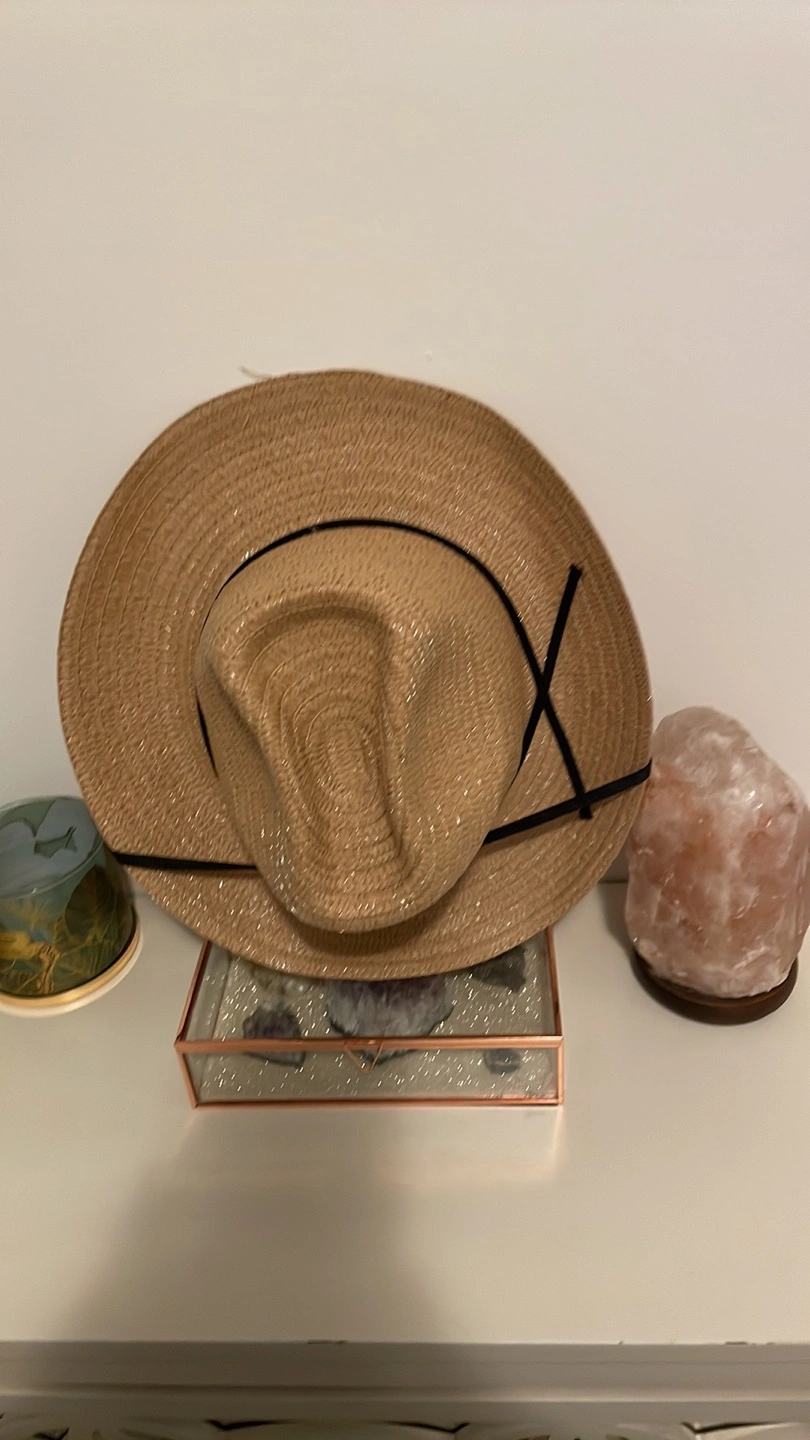 Tan coloured straw cowboy hat. Features a black ribbon band. Lightweight and comfortable. Perfect for summer.