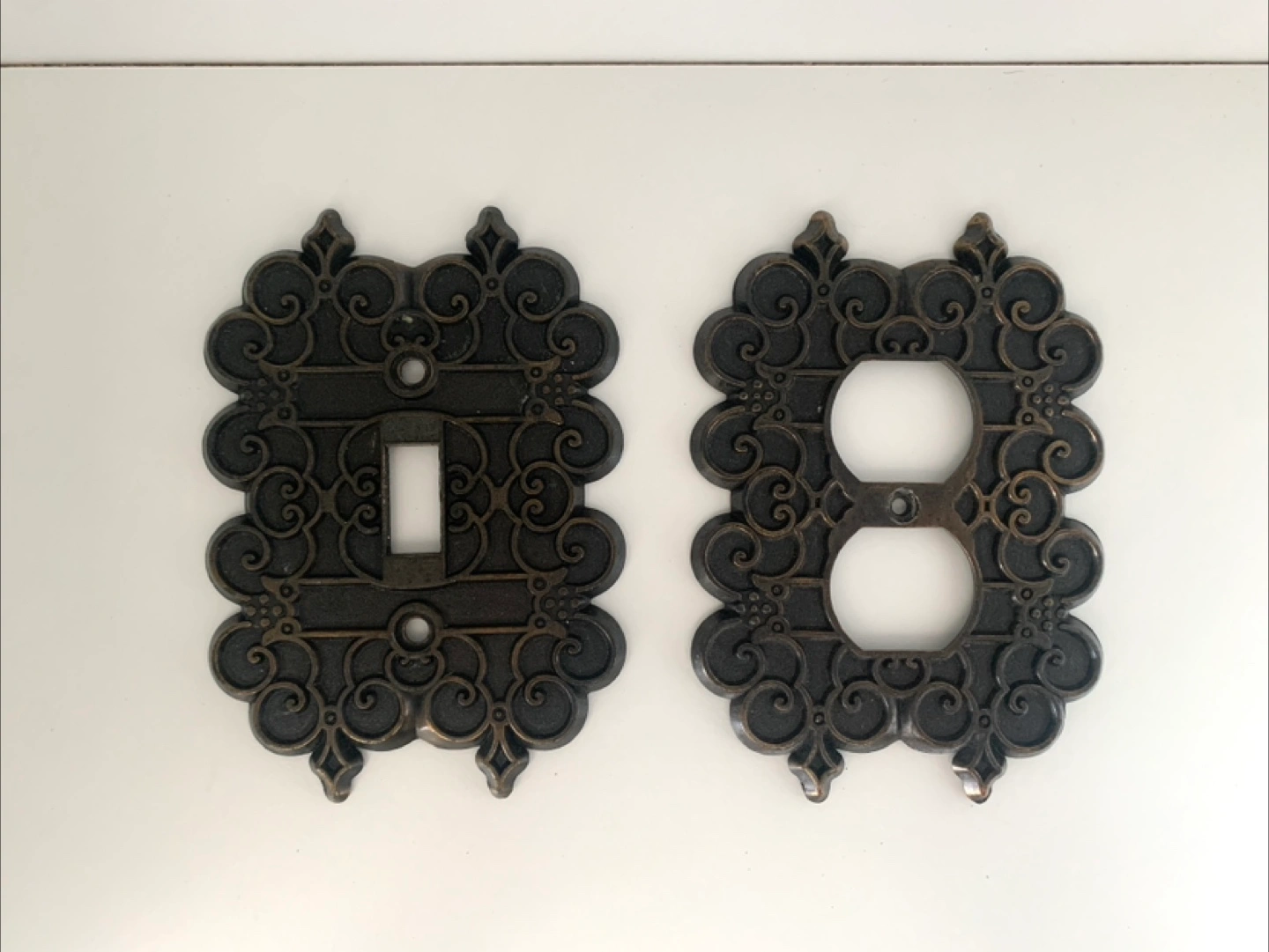 Set of two vintage wall plates (light switch and outlet plate). Dark chocolate/bronze finish. Intricate scroll design. Perfect for adding character to your home.