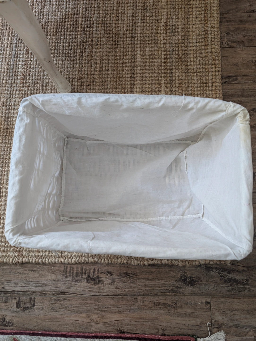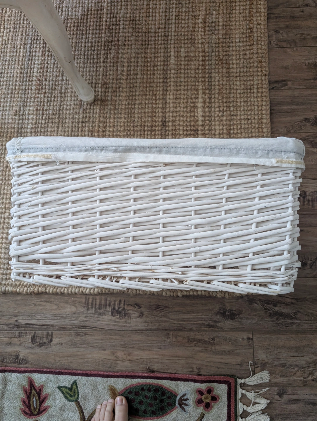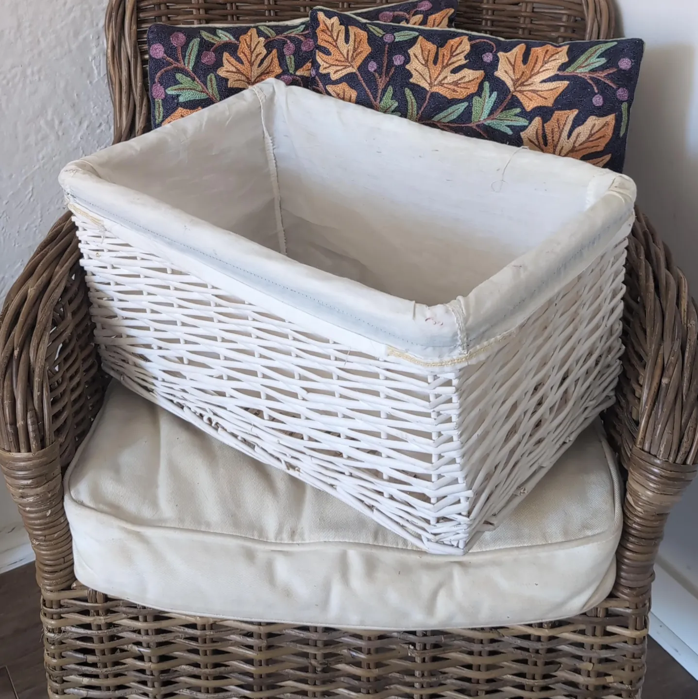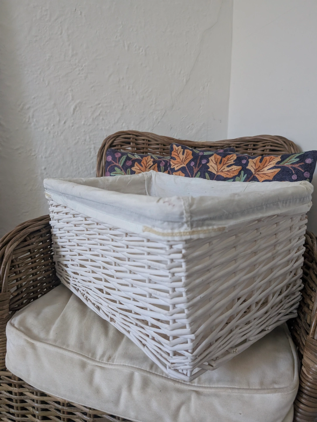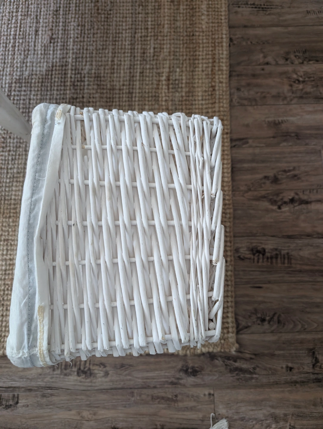 Rectangular white wicker storage basket. Features a removable fabric liner. Perfect for organizing or storage.