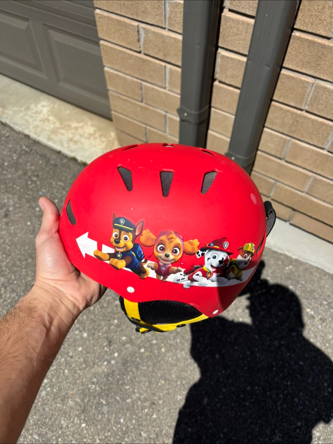 Red kids' ski helmet. Features Paw Patrol characters. Minor wear and tear. Adjustable sizing.