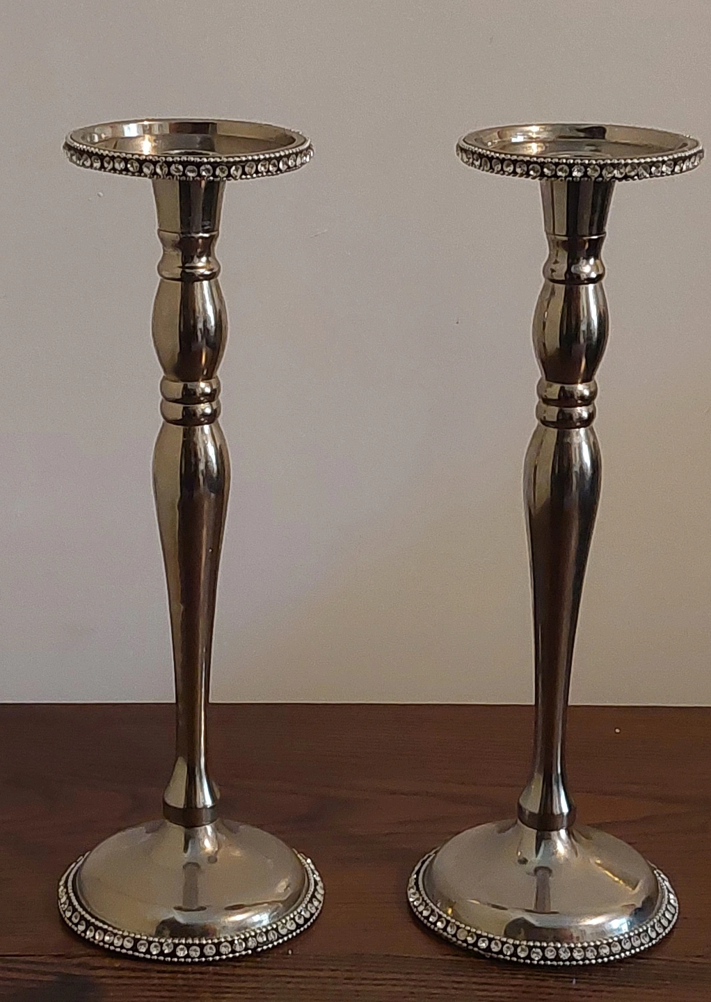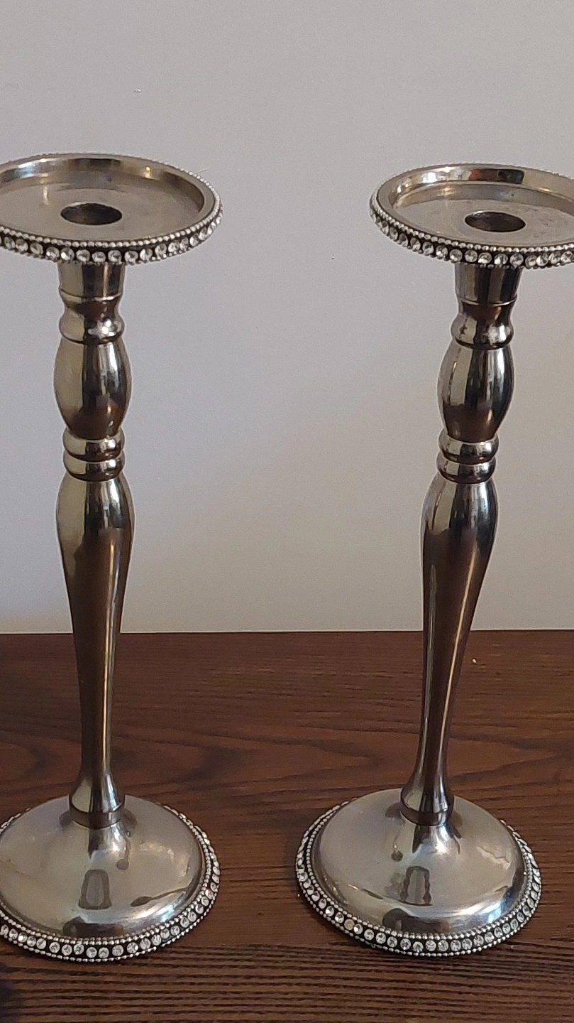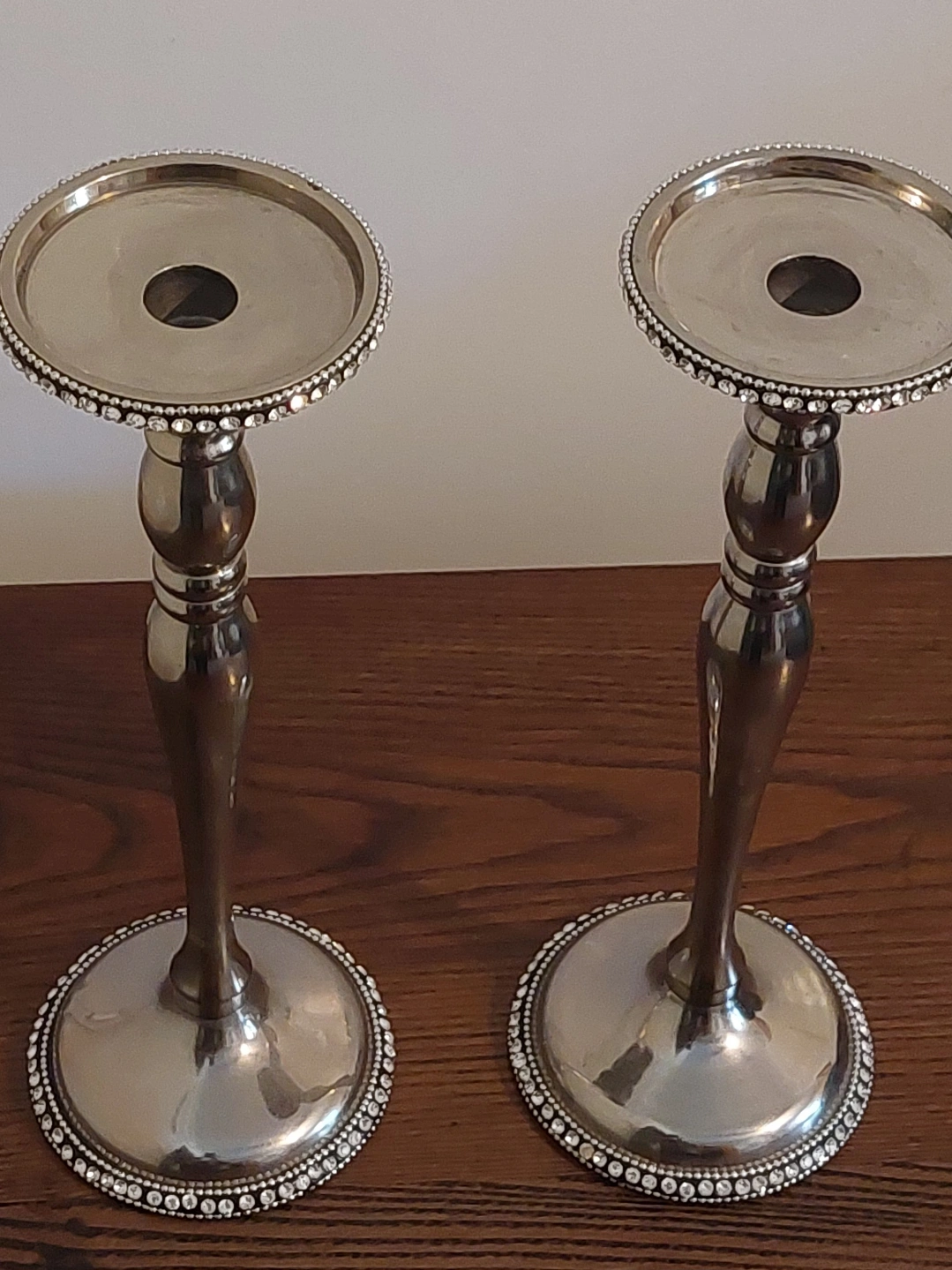 586Elegant candle holders. Silver metal finish. Rhinestone detailing around the base and top. Perfect for centrepieces or home décor. $16 for both