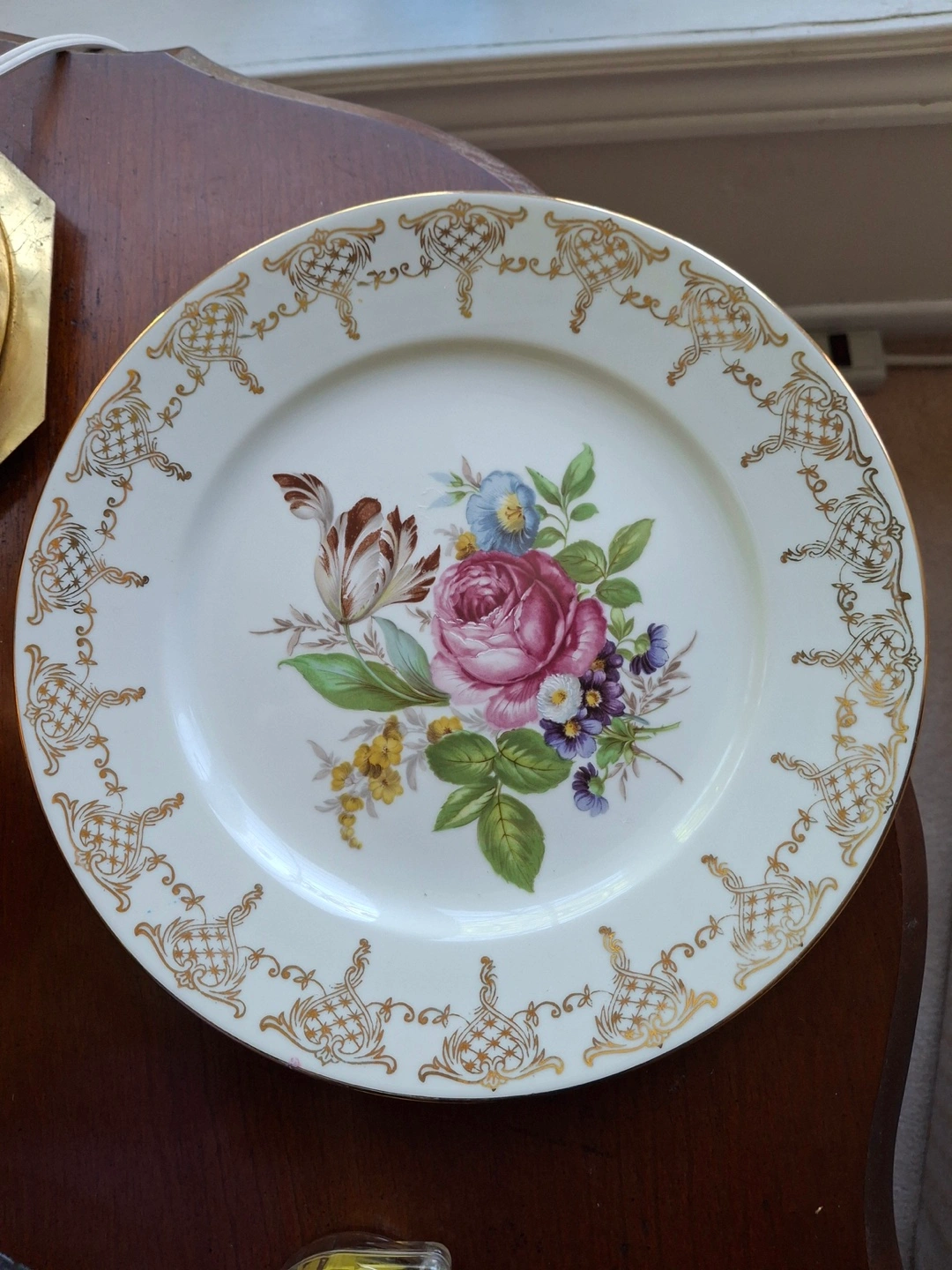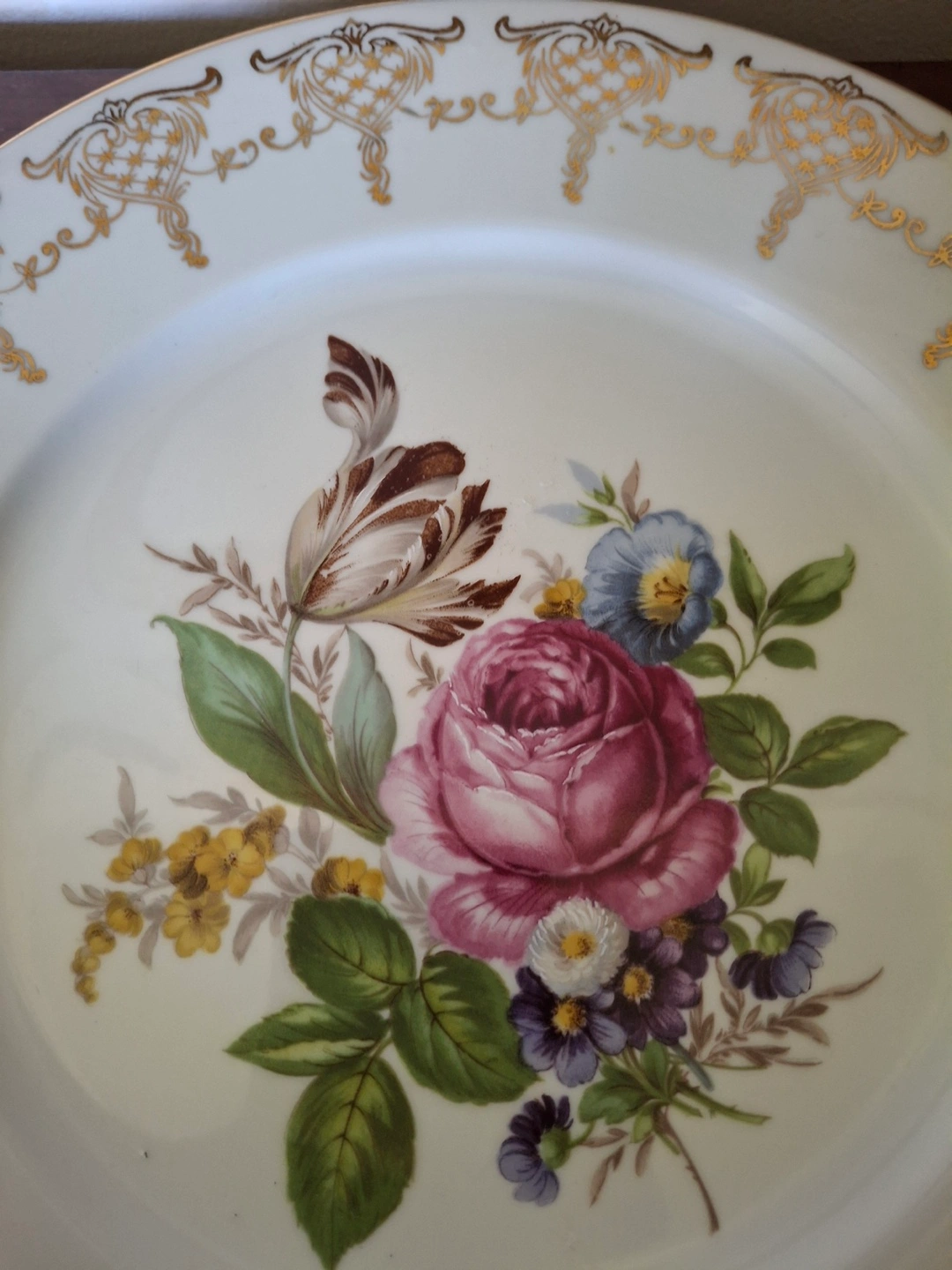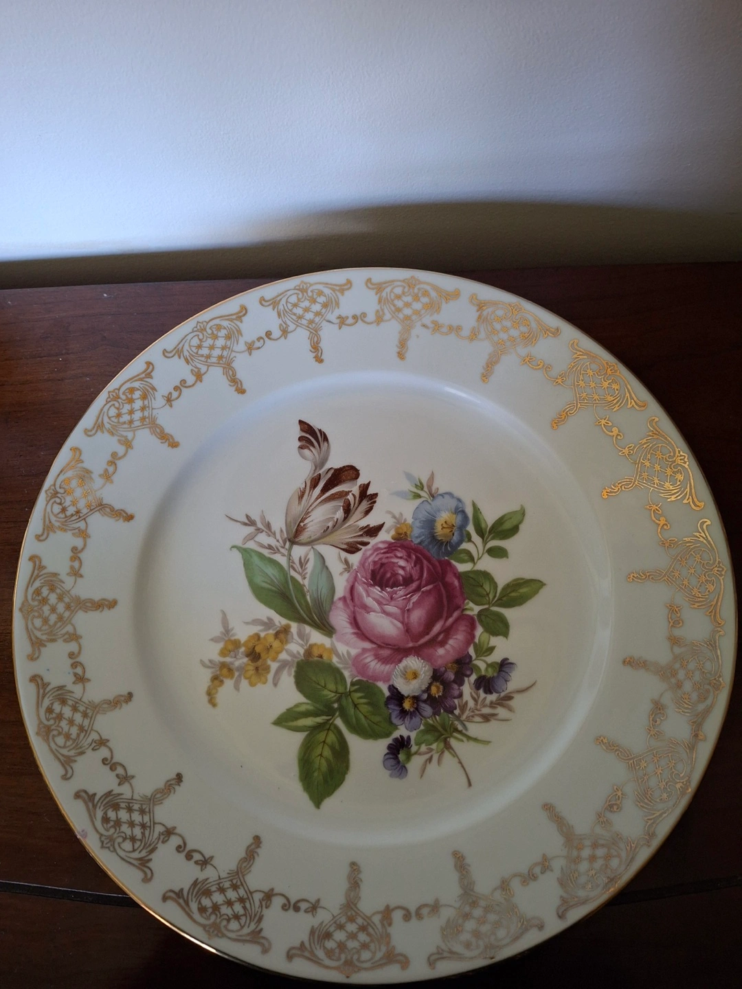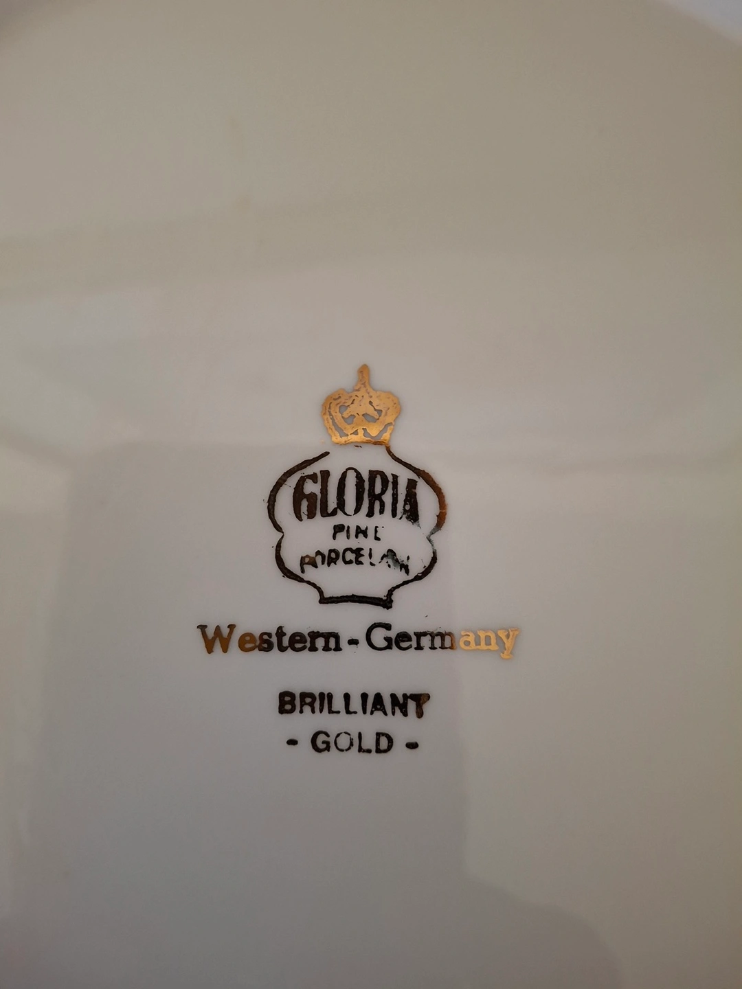 1000+Beautiful vintage plate, Gloria Fine Porcelain “Brilliant Gold.” Features floral design. Gold detailing around the edge. Made in Western Germany. 10” round. Excellent condition. Available for pickup in Markland Wood.
