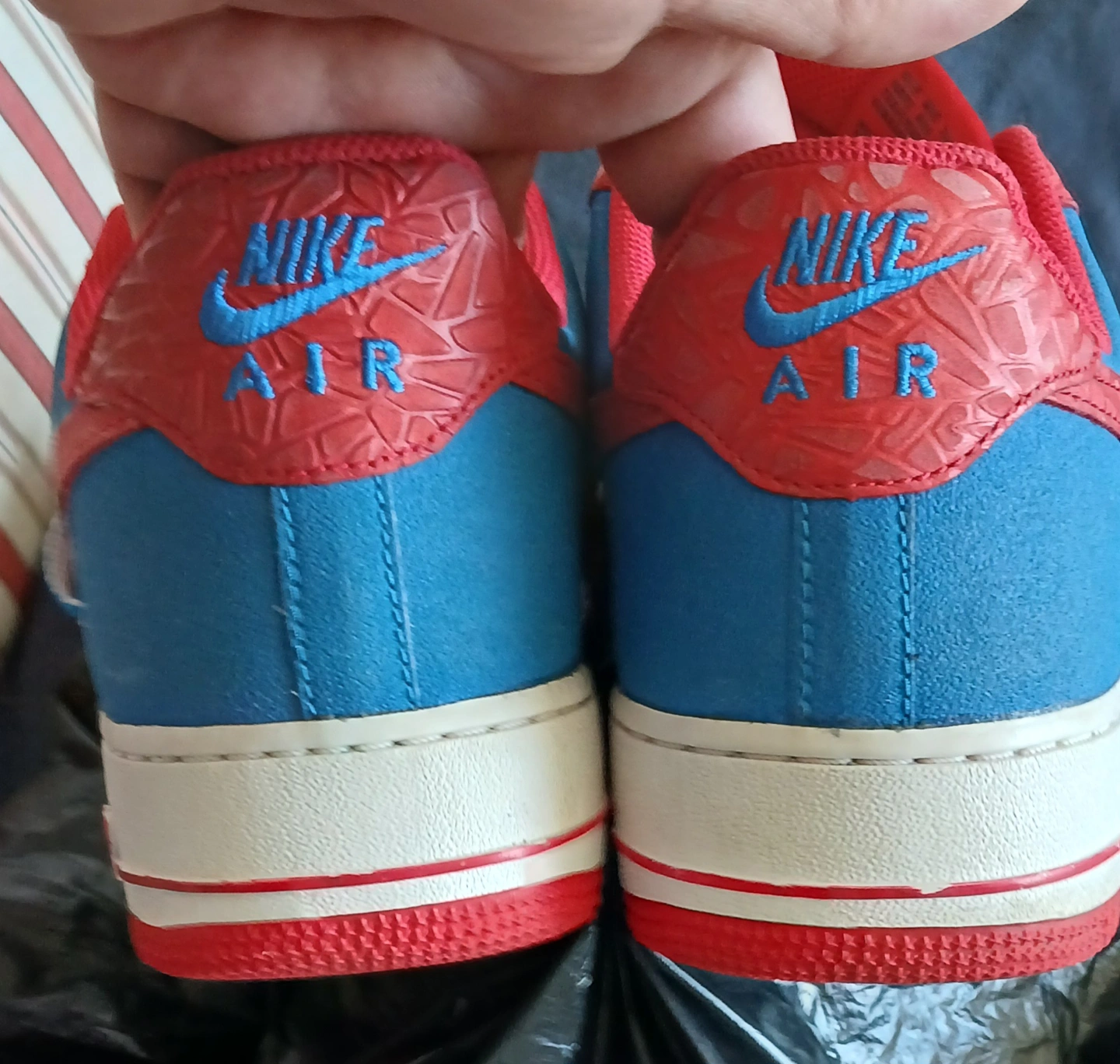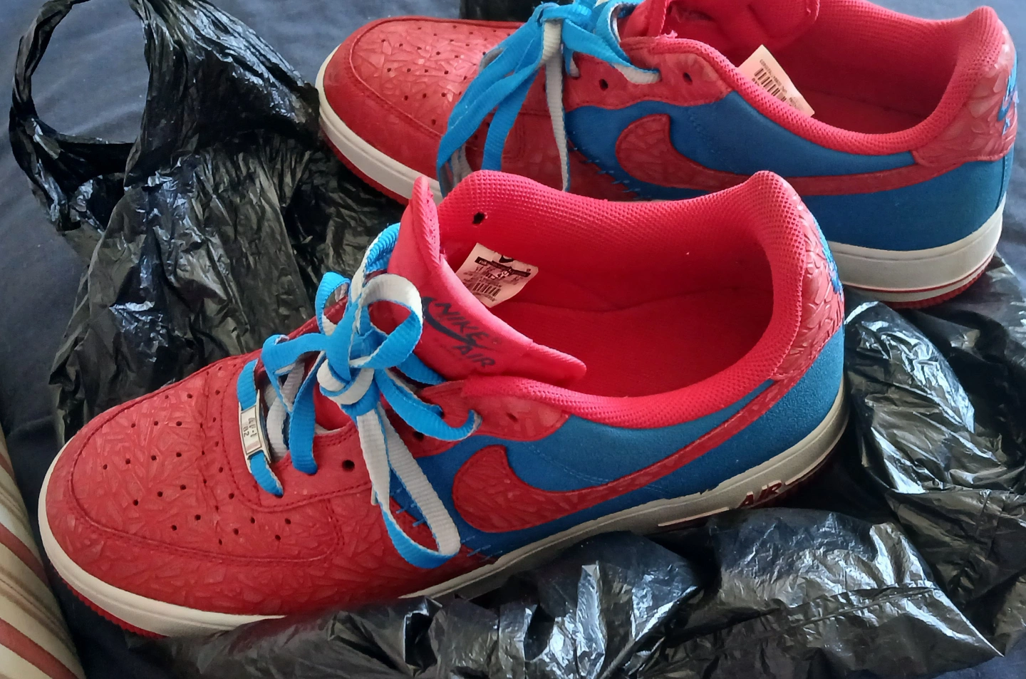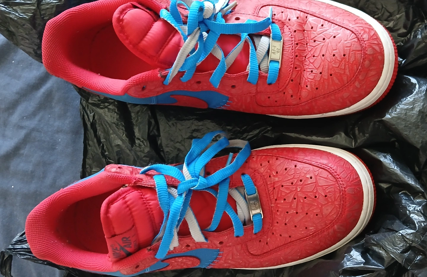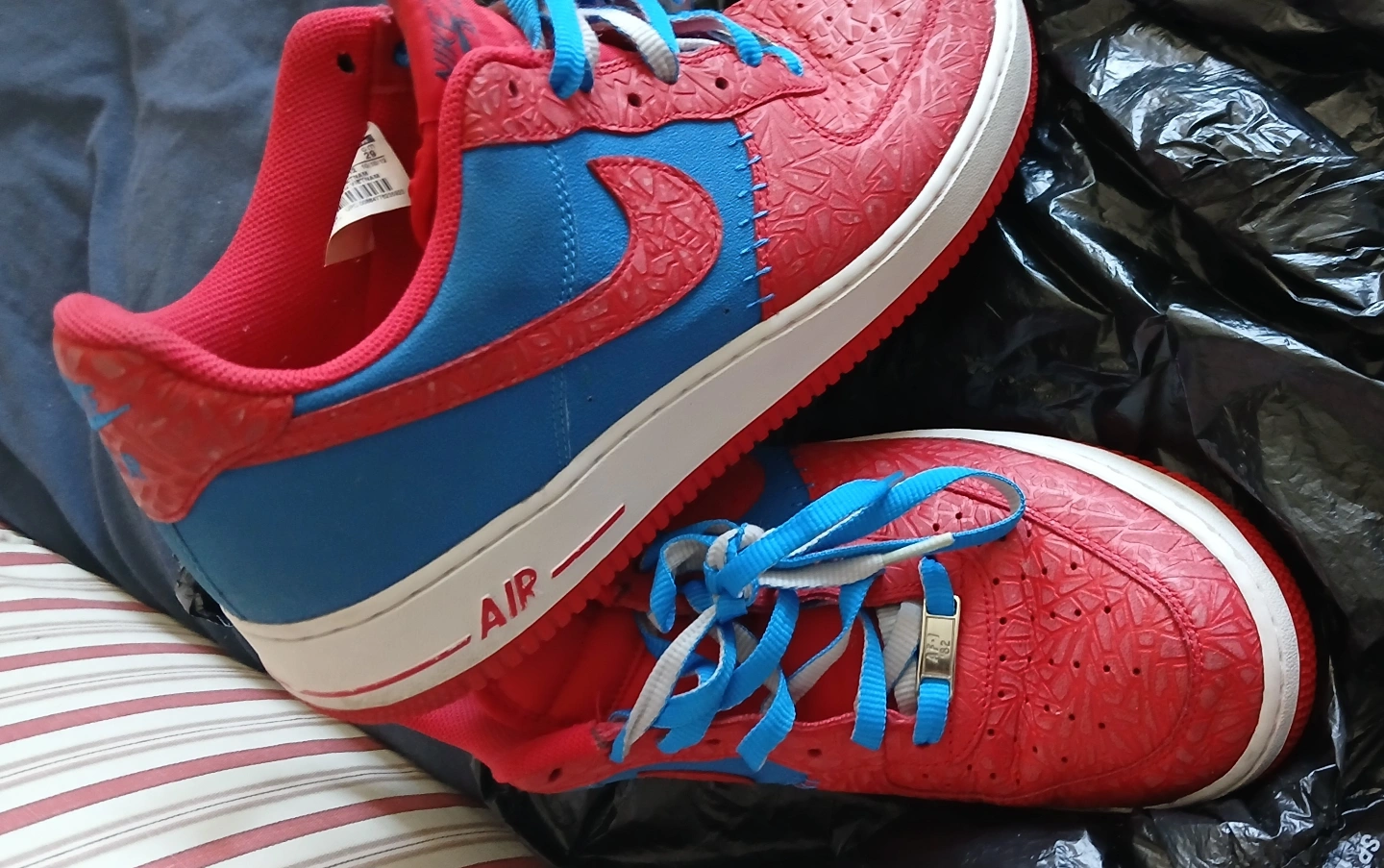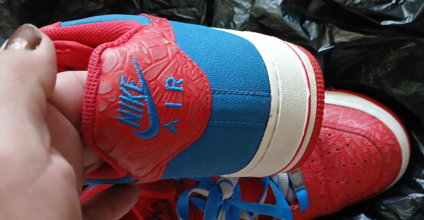 Pre-owned Nike Air Force 1 Low sneakers. Red and blue colorway. Unique textured design. Spider-Man themed Size 11
