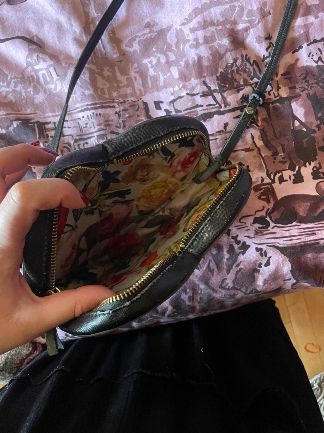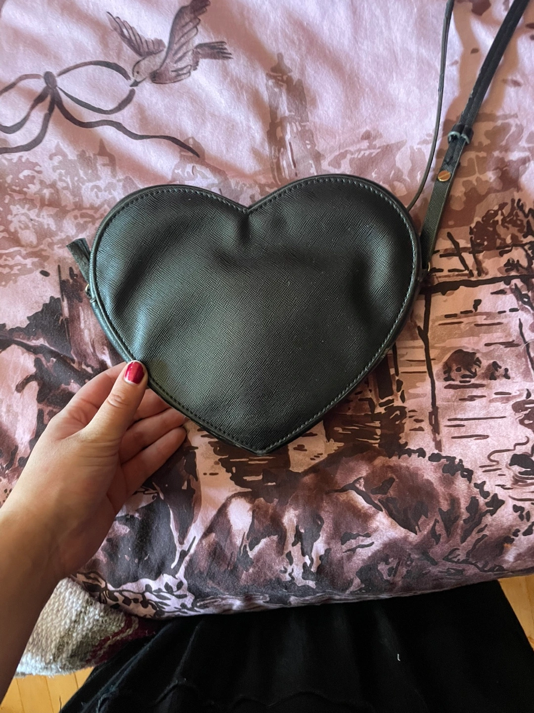 Adorable heart-shaped crossbody bag. Features a black exterior and floral interior. Adjustable strap. Small size, perfect for essentials. Strap shows wear but is replace.