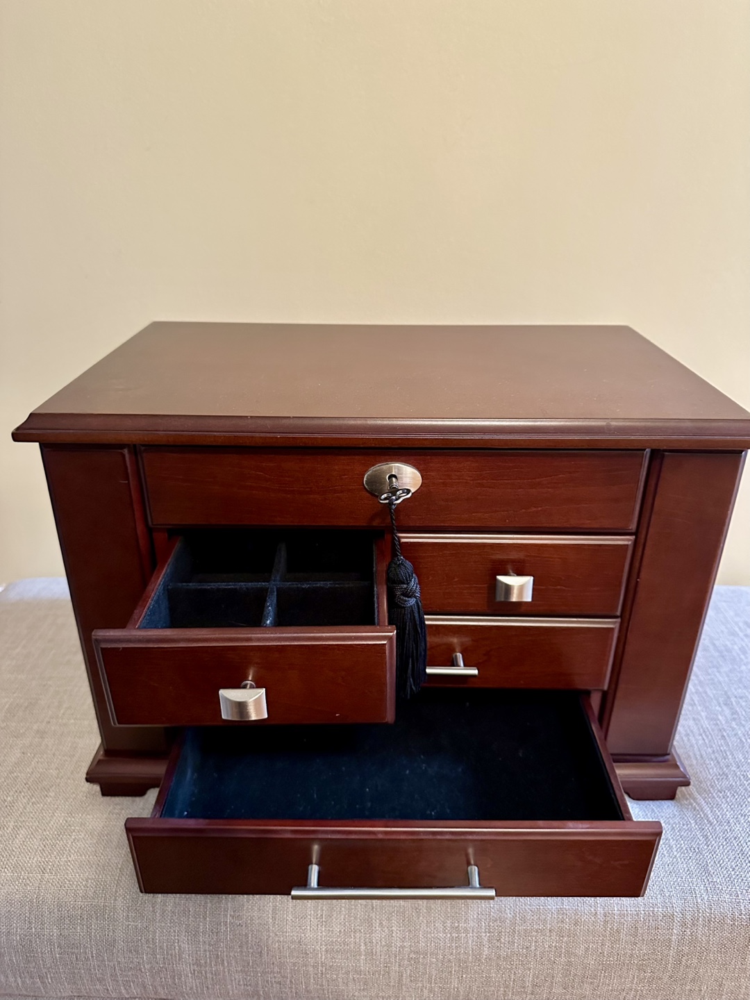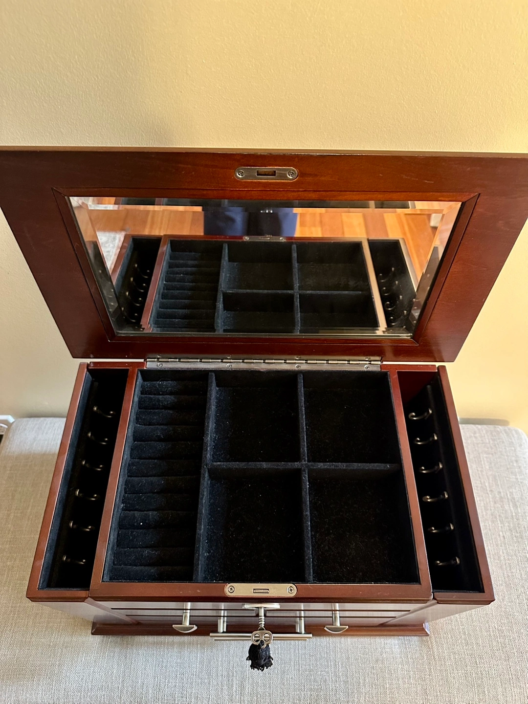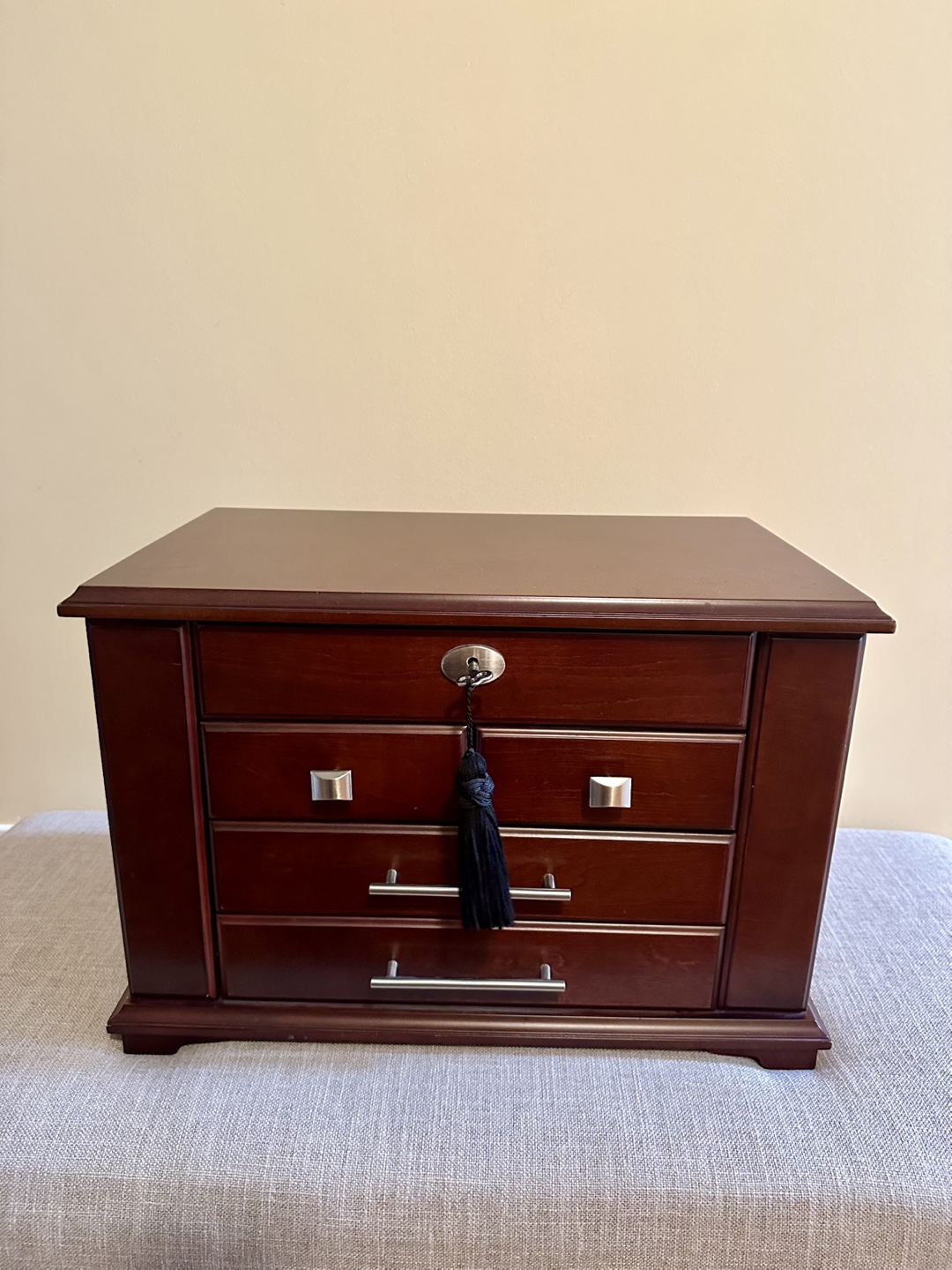 Dark brown wooden jewelry box. Features three drawers, a lift-up lid with a mirror, and compartments for rings and earrings. Includes two sets of keys and a small black tassel.