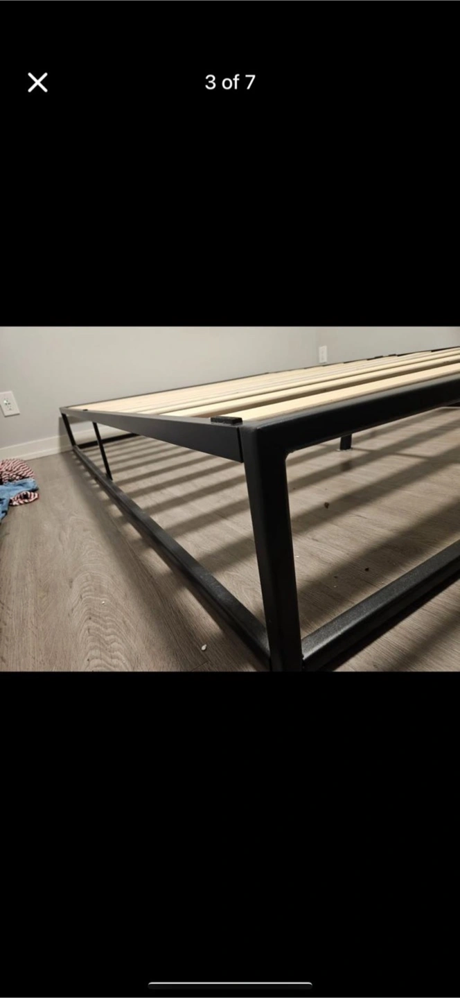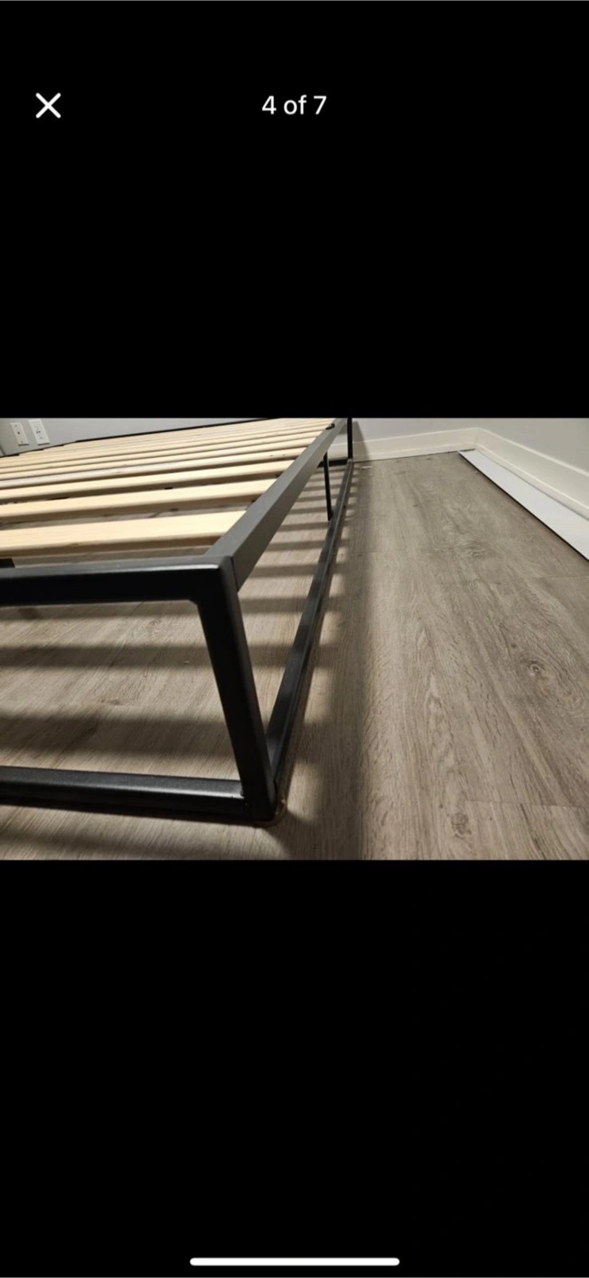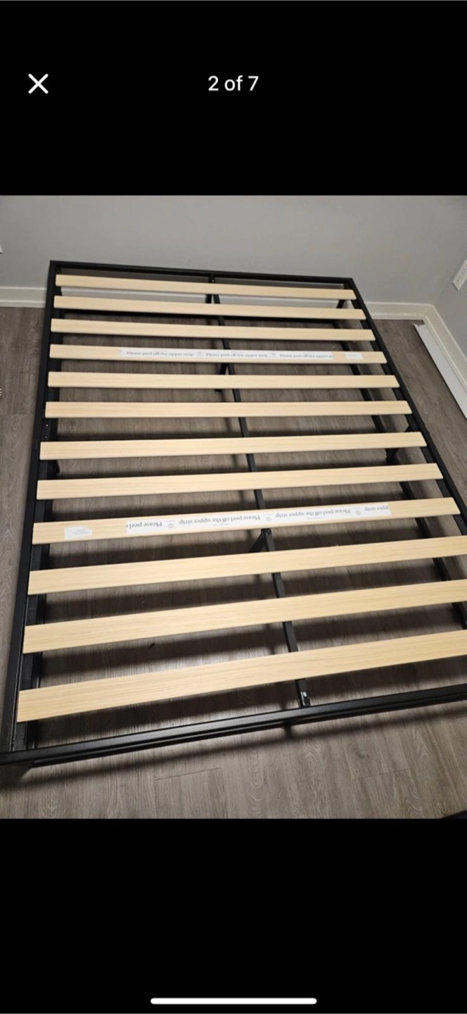 Sturdy queen-size platform bed frame. Black metal frame with wooden slats. Minimalist design. Easy assembly.