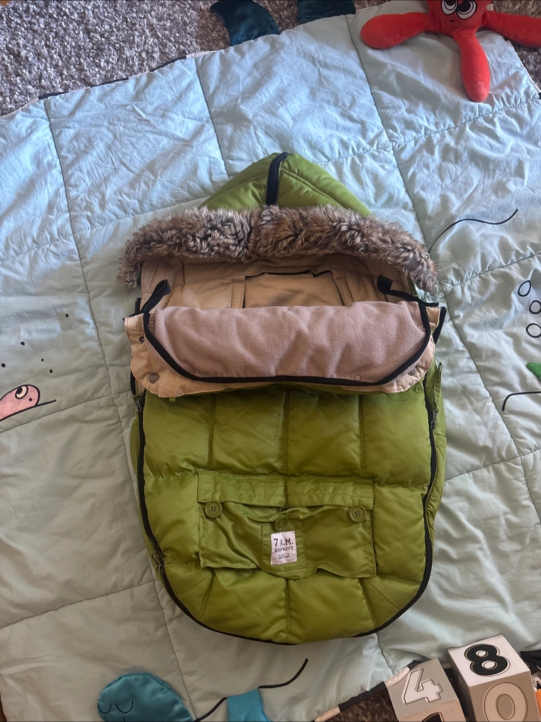 Cozy baby carrier bunting cover. Lime green exterior, faux fur trim. Suitable for various carriers. Keeps baby warm in cold weather. Pre-owned, excellent like new condition.