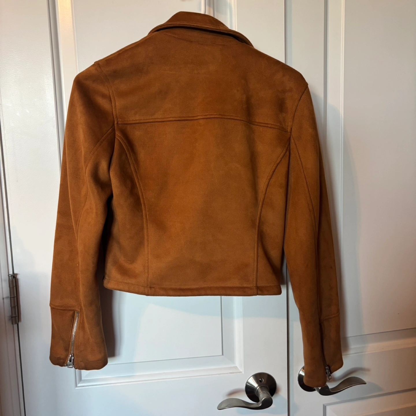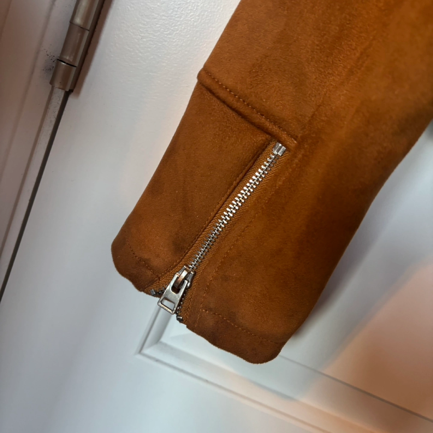 Orange brown suede jacket. Zip closure. Size US 2. Long sleeves with zip cuffs.