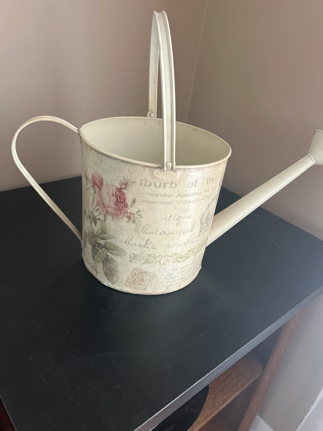 Adorable metal watering can. Features a cream colour with floral and vintage design. Perfect for home decor or gardening.
