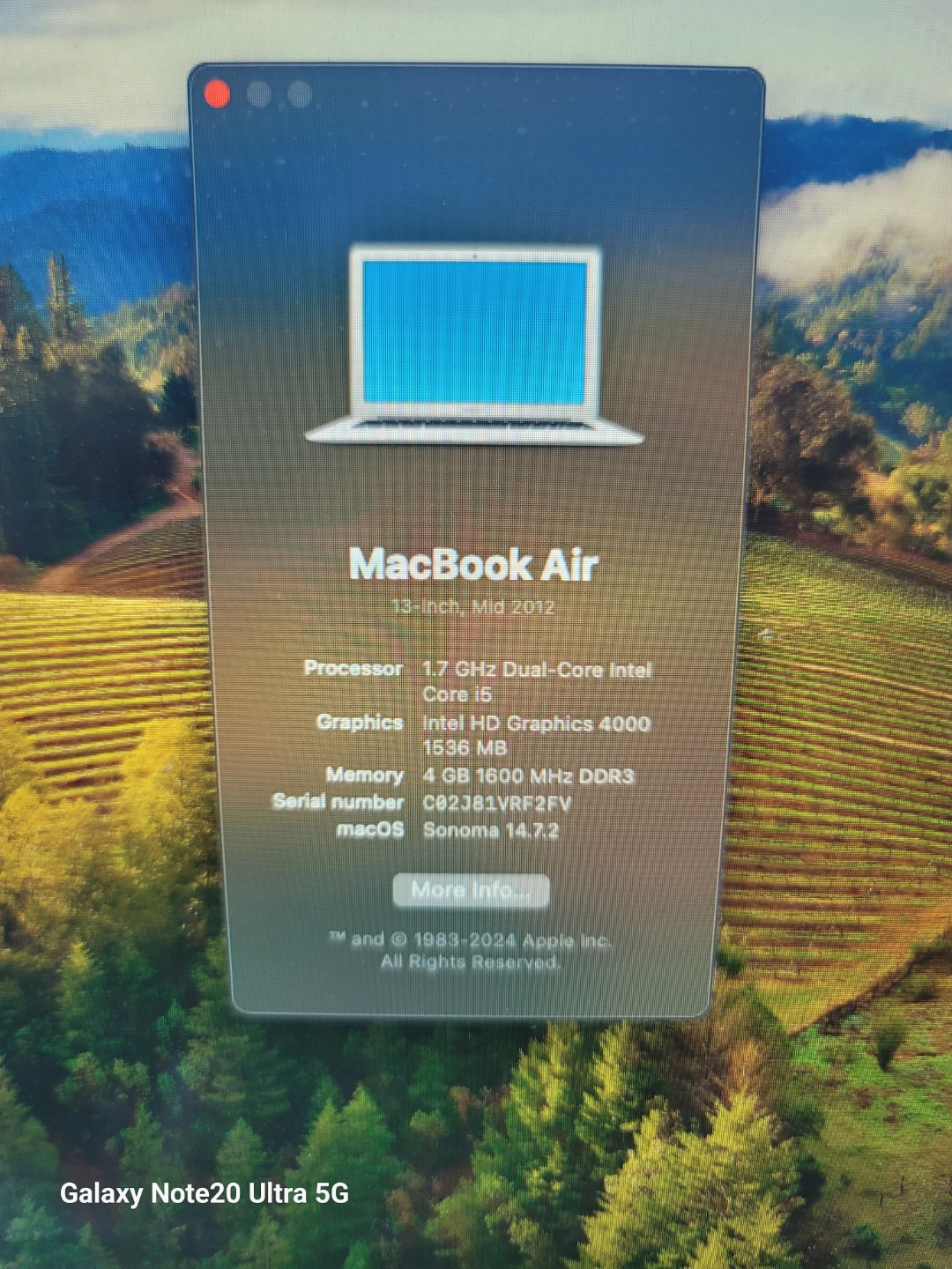 Hello everyone!!! Up for sale is my trusted 13-inch MacBook Air. Mid 2012 model. Features a 1.7 GHz Dual-Core Intel Core i5 processor. Includes 4 GB 1600 MHz DDR3 memory. macOS Sonoma 14.2. Battery at 50% charge.