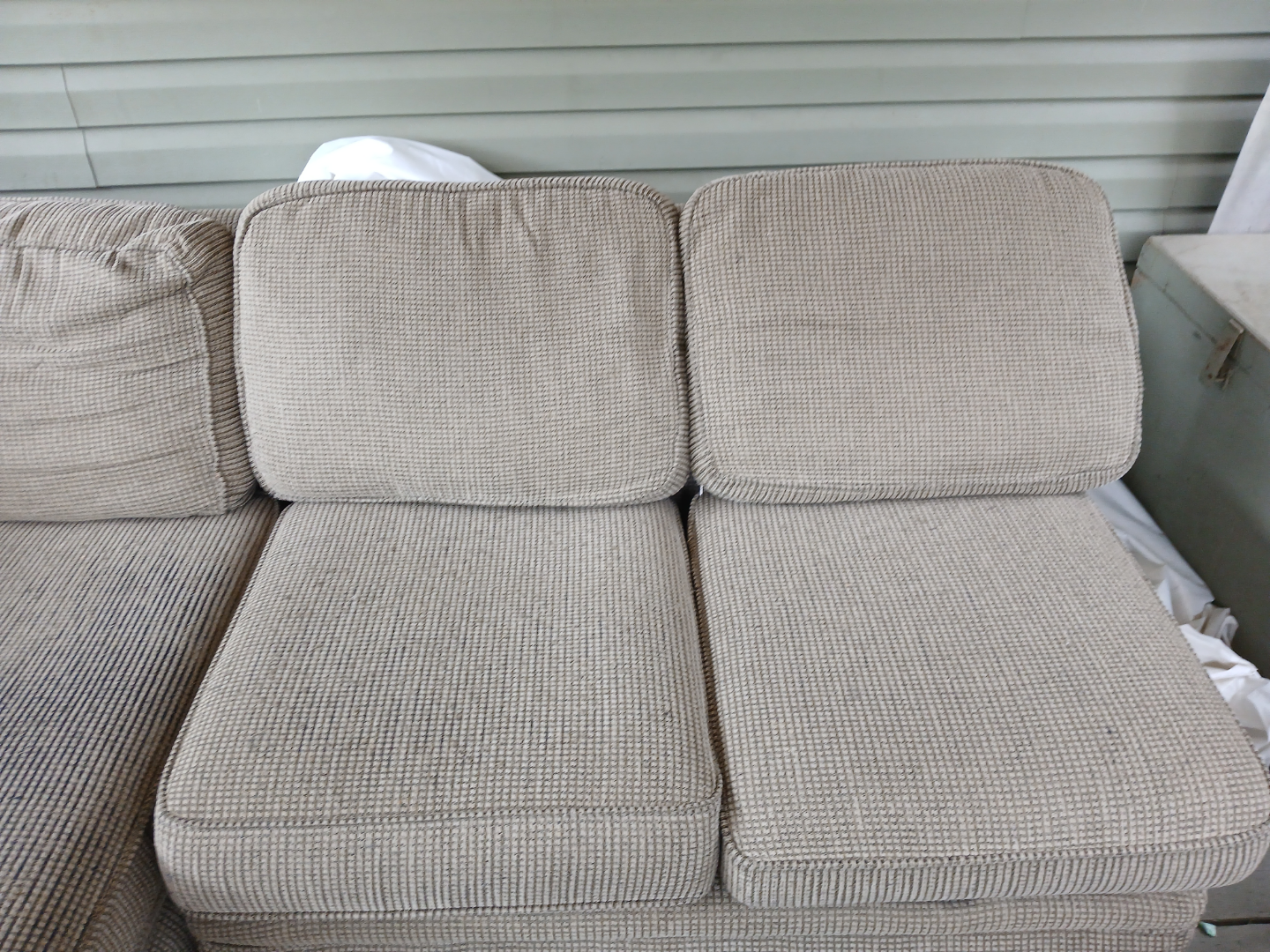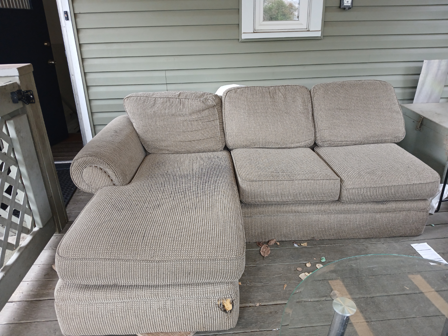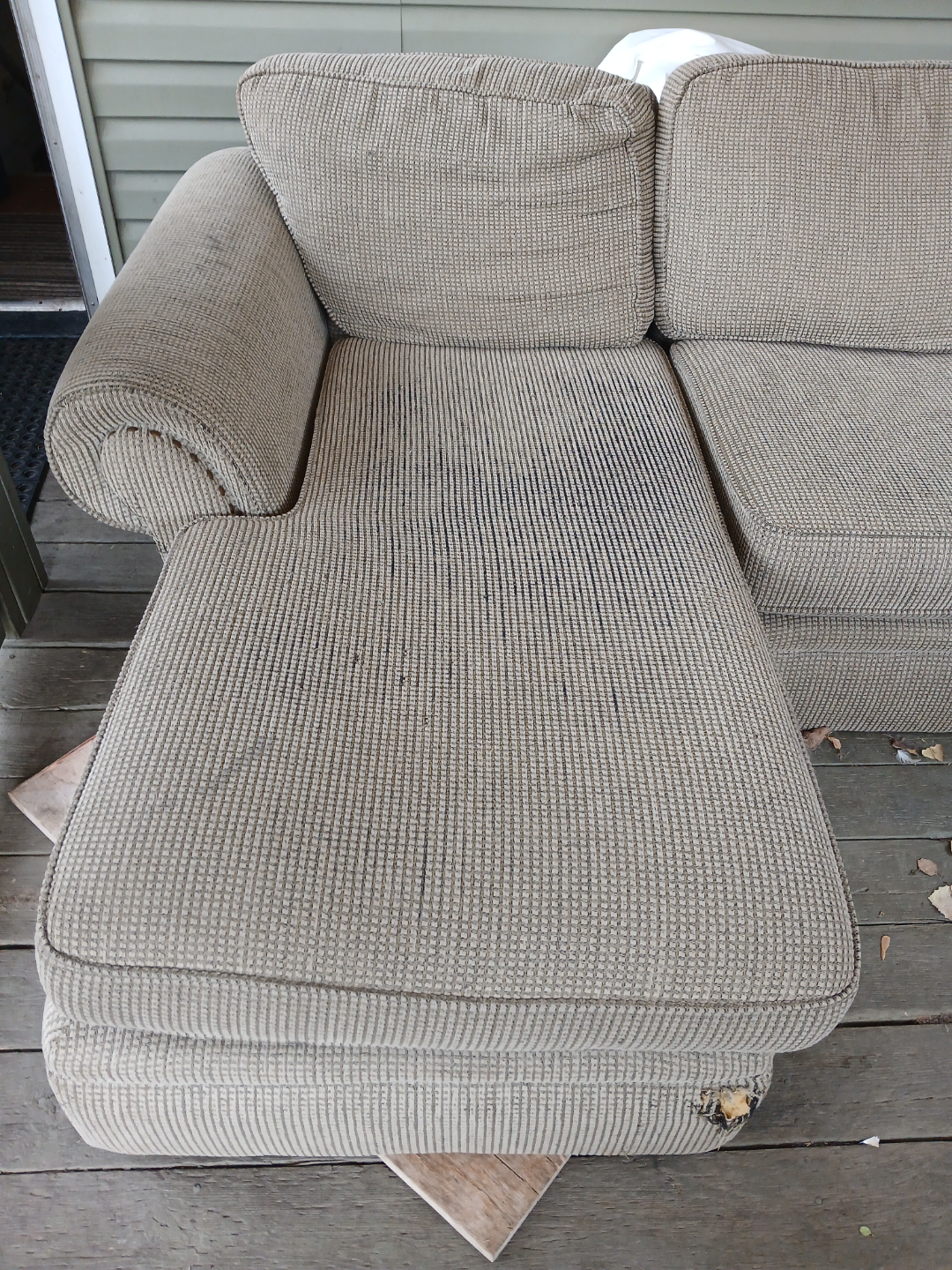 Used beige sectional sofa. Three-seater with chaise lounge. Some staining. Needs cleaning and some small repair and/or a sofa cover