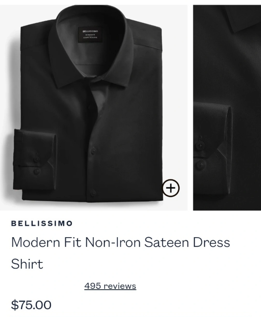 Men's black dress shirt. Modern fit. Non-iron sateen. Long sleeves. Button closure.