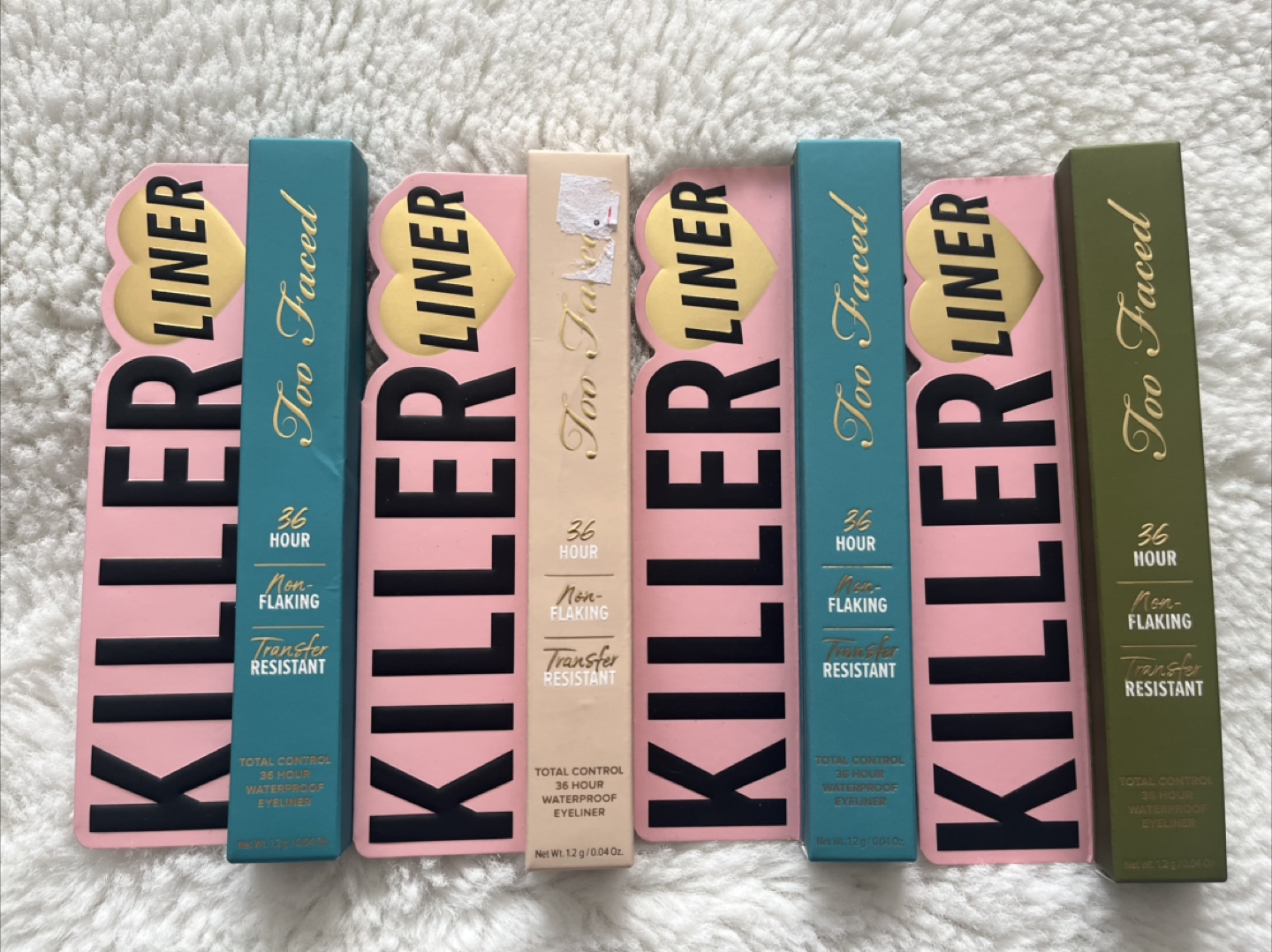 Take all : 4 Too Faced Killer Liner eyeliners in various shades. One Born This Way foundation in shade Mahogany. 36-hour, waterproof, non-flaking, transfer-resistant formula. Oil-free foundation. New, never used.