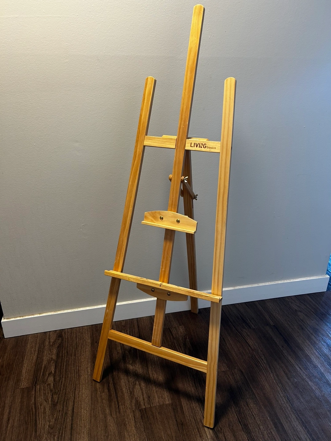 10Portable wooden easel. Adjustable height. Ideal for painting or displaying artwork. Good condition.