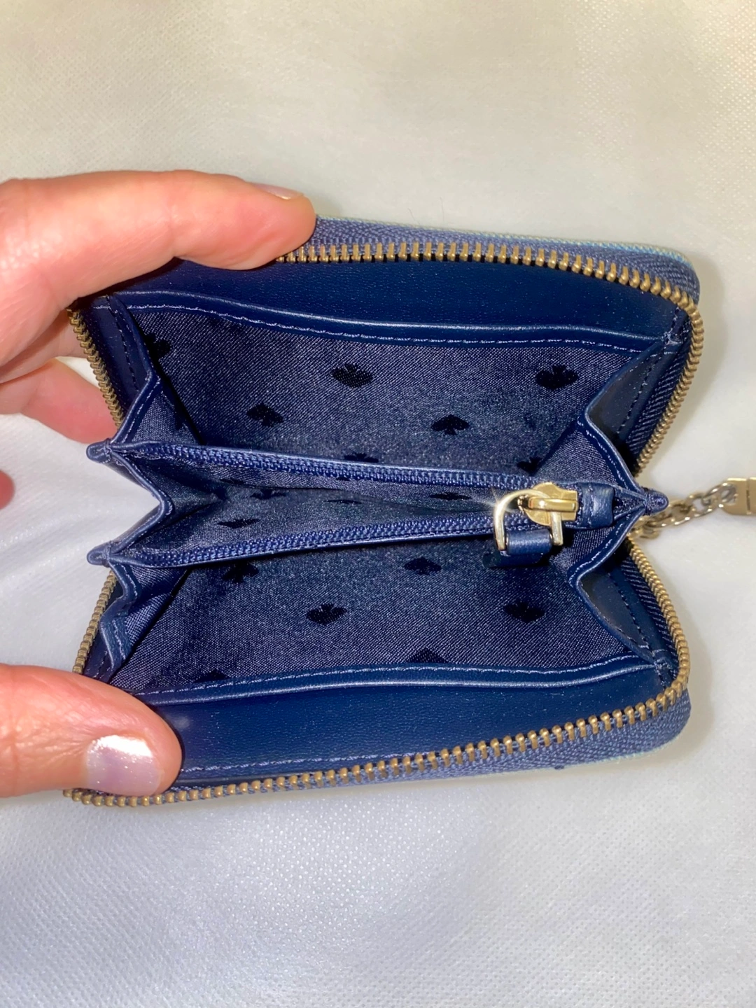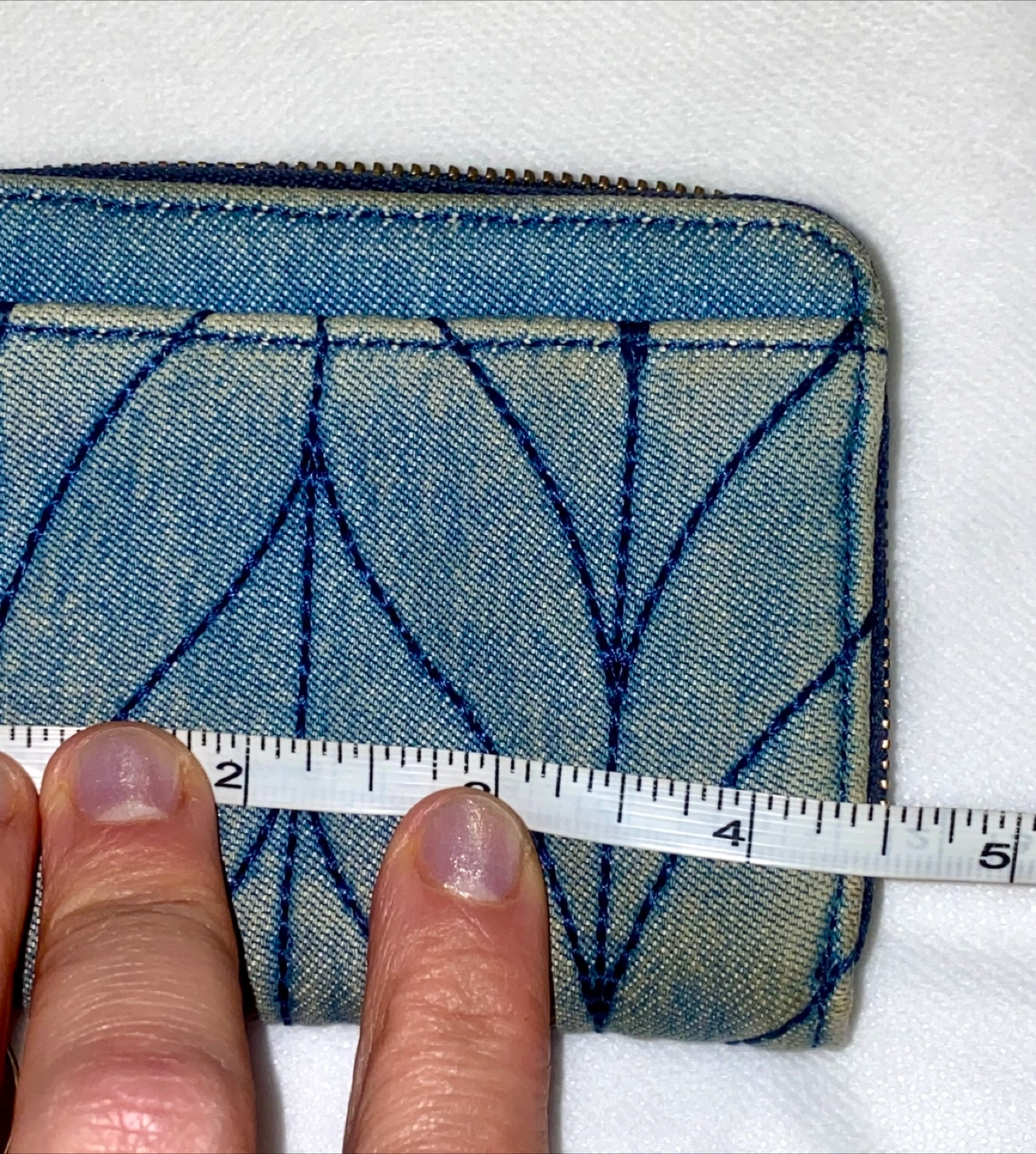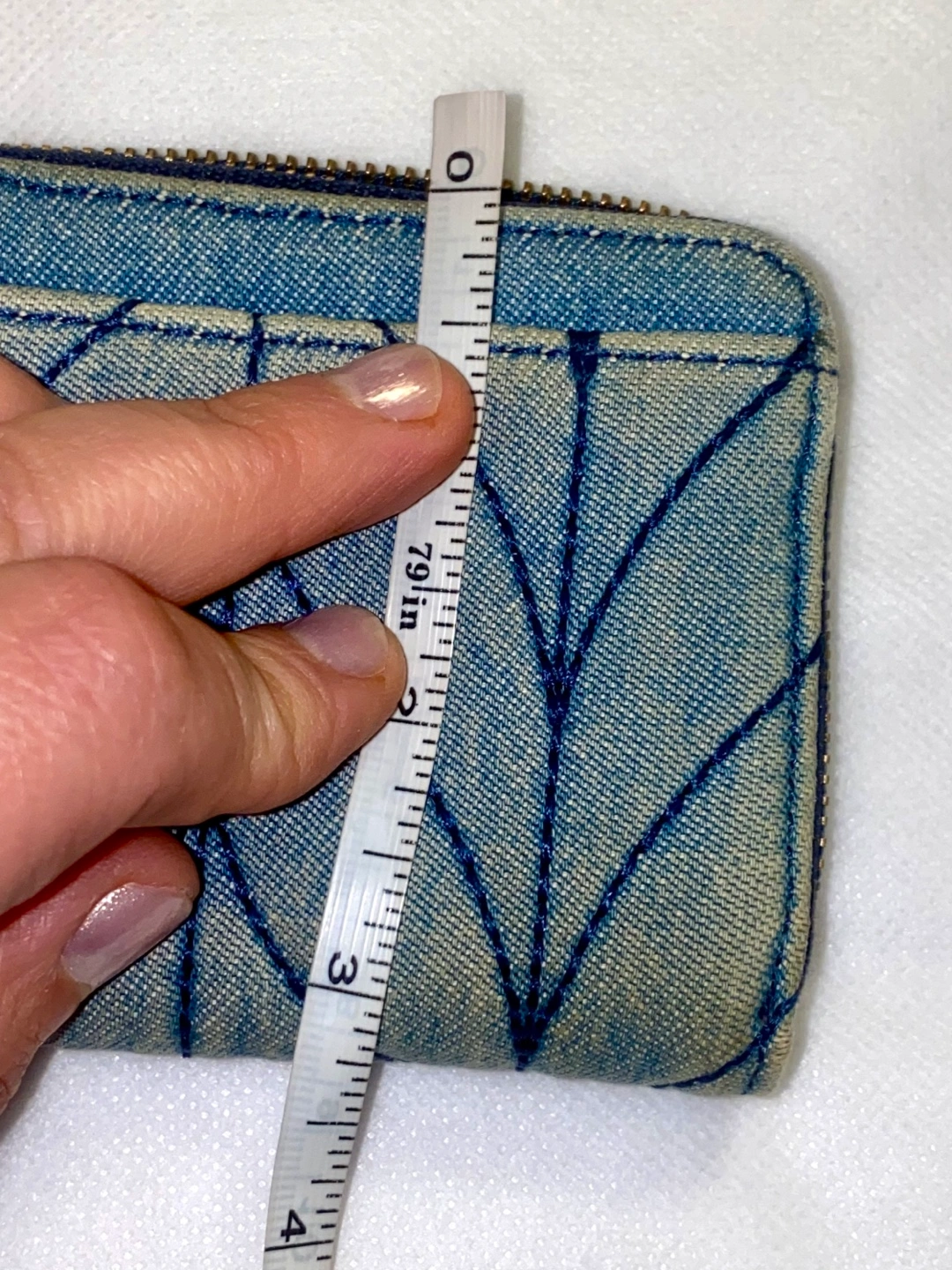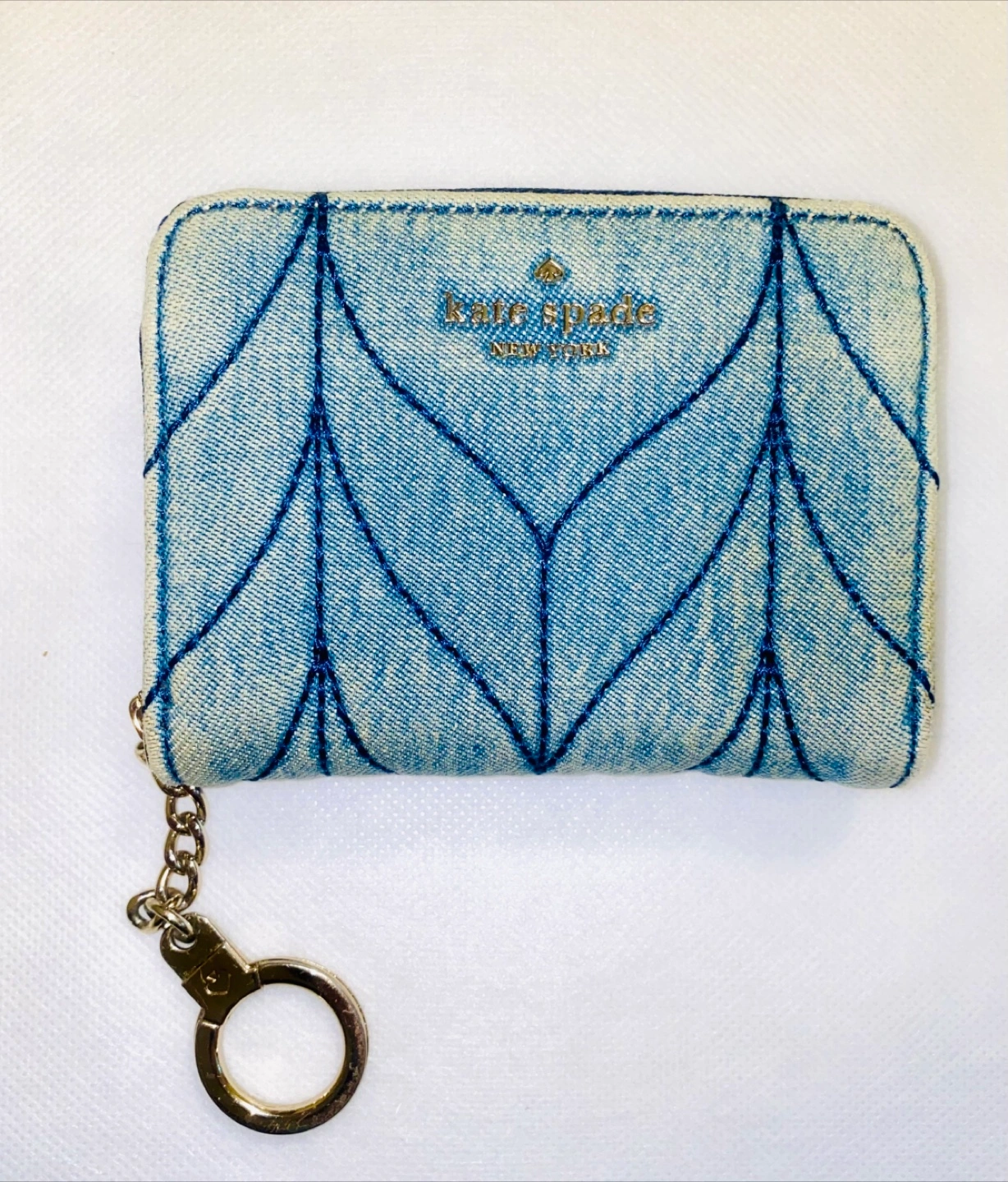 Adorable light blue denim wallet. Features a unique quilted pattern and gold-tone hardware. Compact design, perfect for everyday use. Includes a handy attached keychain.