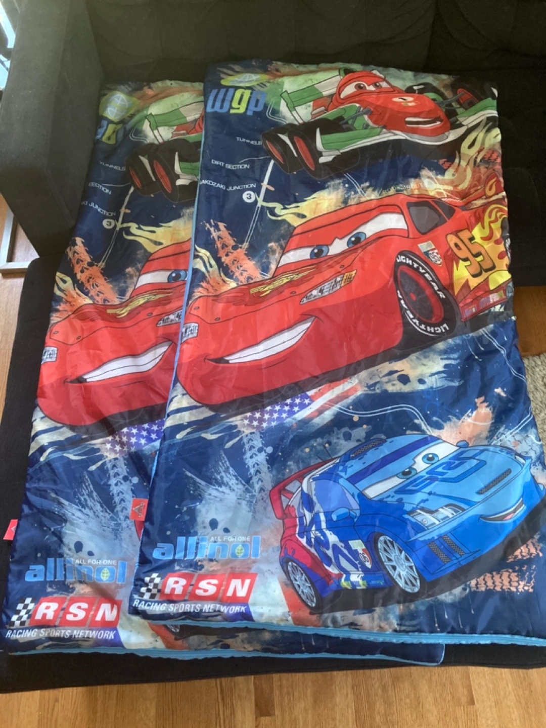 Two Cars-themed sleeping bags. Features Lightning McQueen and other characters from the movie. Blue and red colour scheme. Side zipper. Great for camping or sleep overs. Approx 30”x52” $20 each.