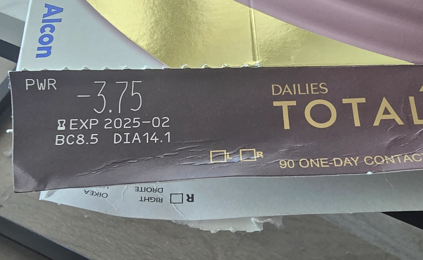 90 one-day contact lenses. Power -3.75. BC8.5 DIA14.1. Expiry date 2025-02. Right eye.