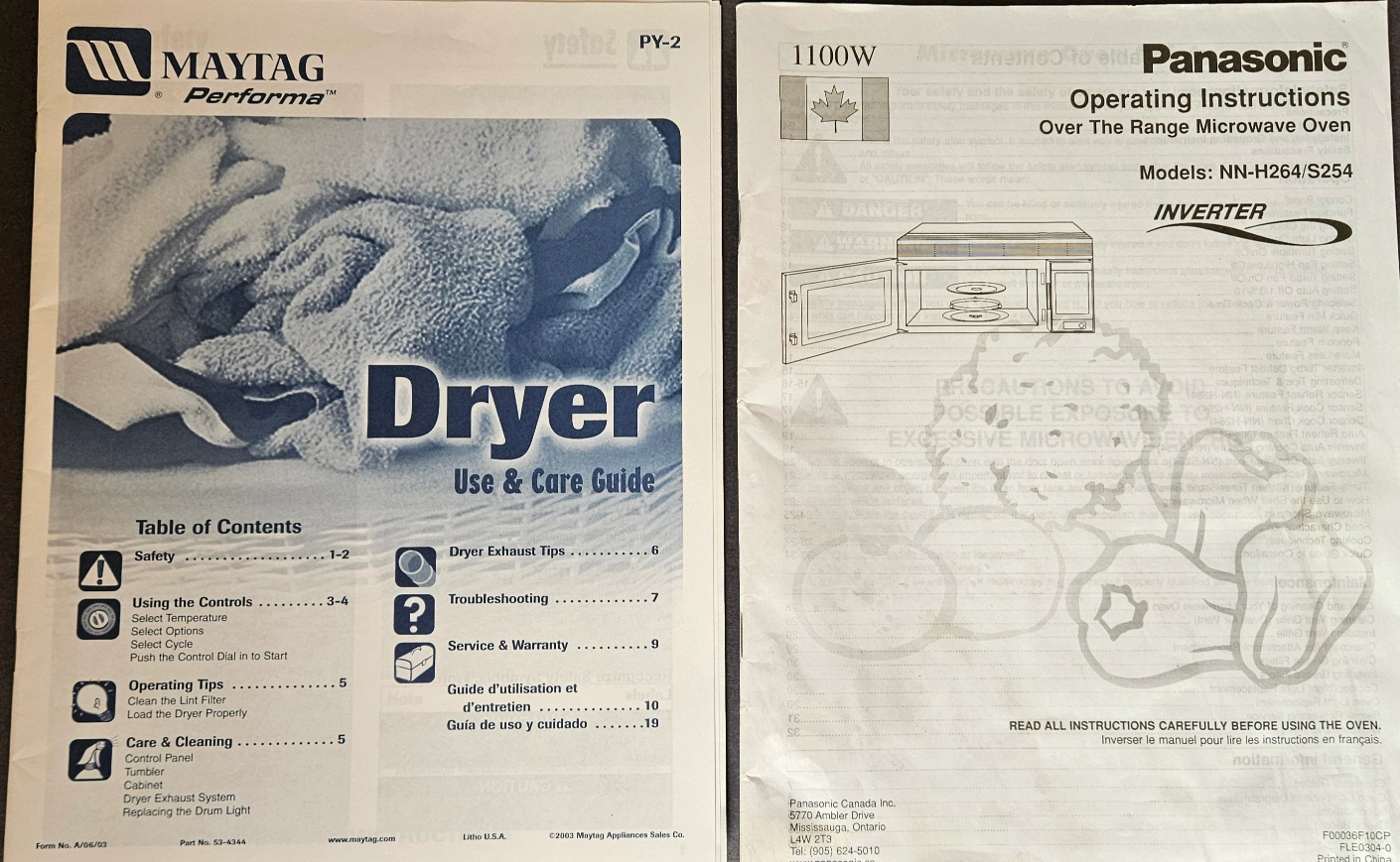 #freecycle - Maytag Dryer and Panasonic Microwave Oven manuals