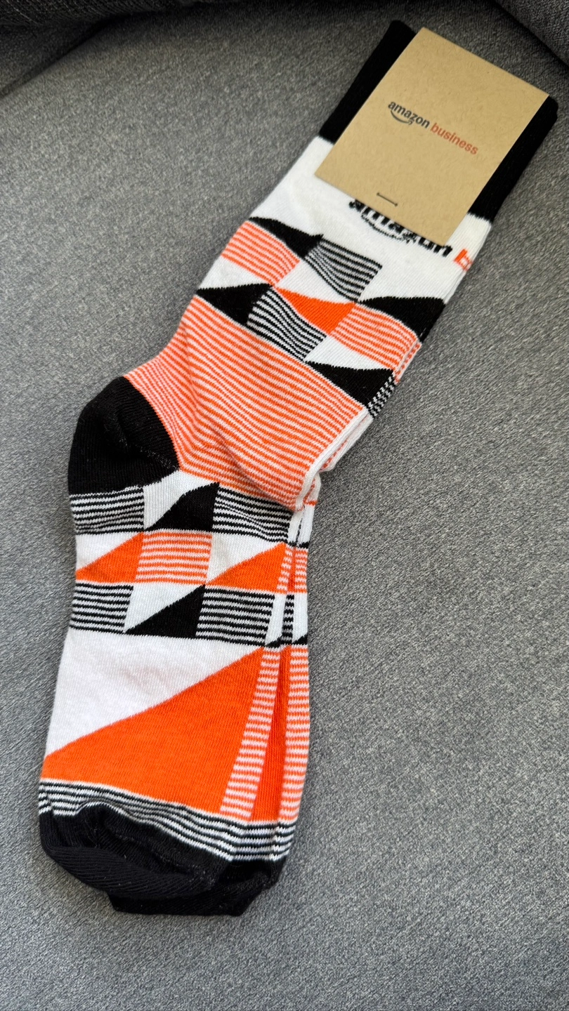 Pair of new Sock Club socks. Geometric pattern in orange, black and white. Size not specified. Purchased from Amazon.