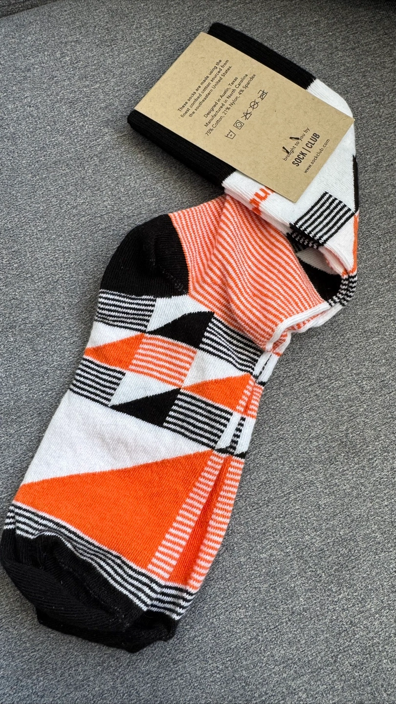 New Sock Club Socks - Orange, Black, and White Geometric Pattern