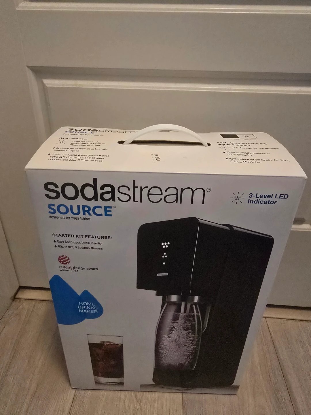 SodaStream Source sparkling water maker. Includes 60L CO2 cylinder and 1L plastic bottle. Black colour. 3-level LED indicator. Starter kit. Makes sparkling drinks quickly.
