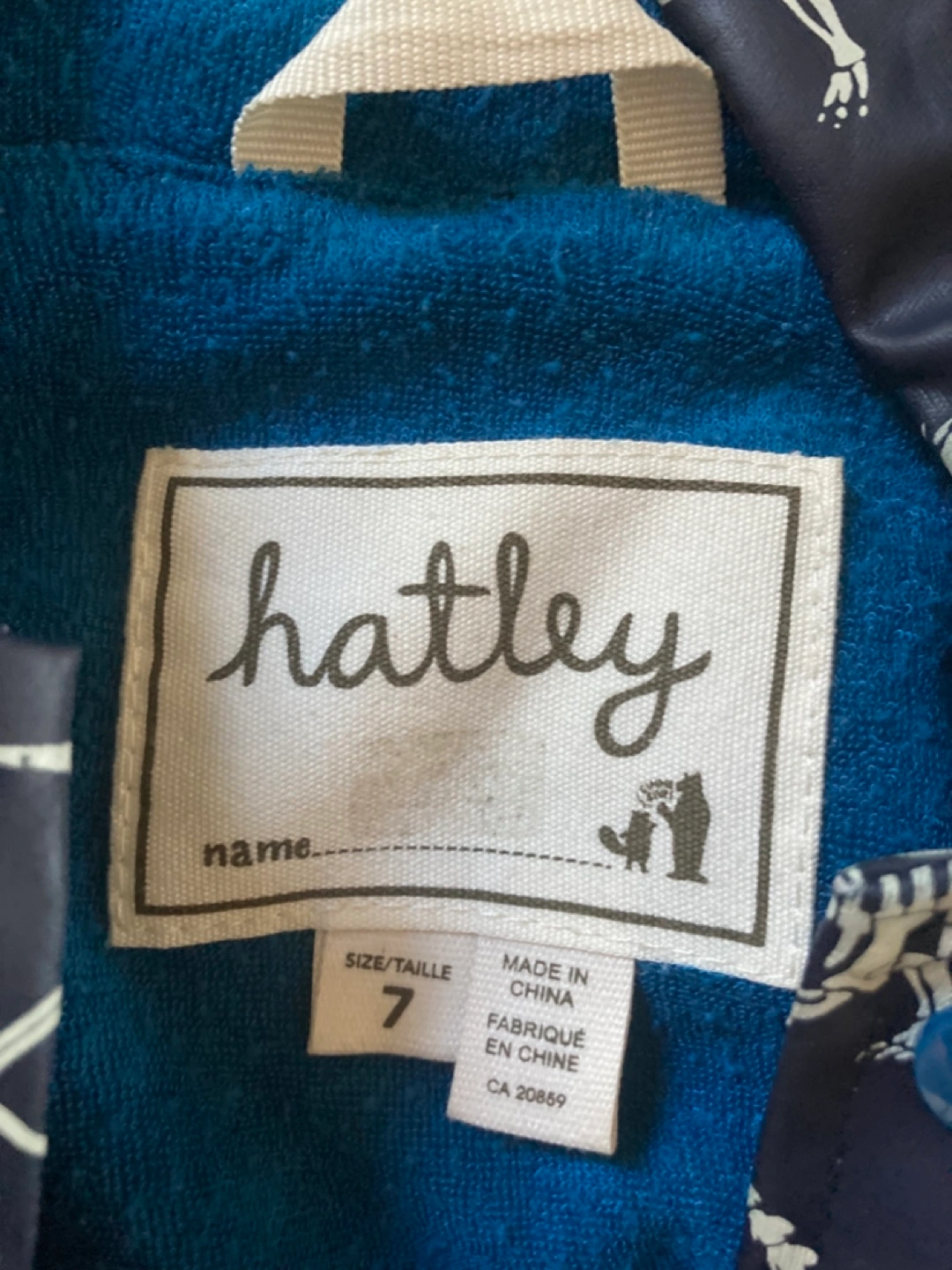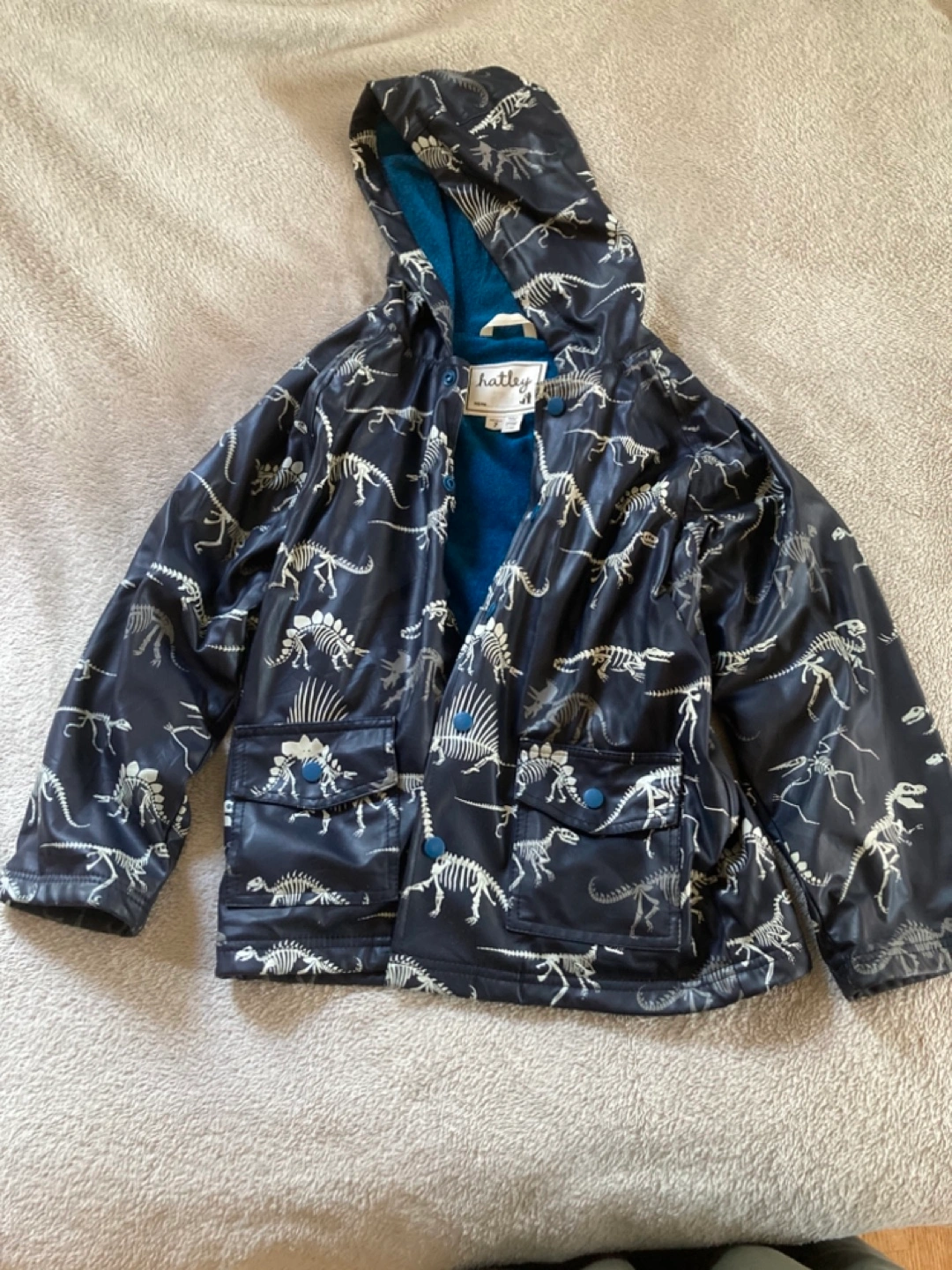 Adorable kids' lined Hatley raincoat. Features a dinosaur skeleton print. Size 7. Great for rainy days.