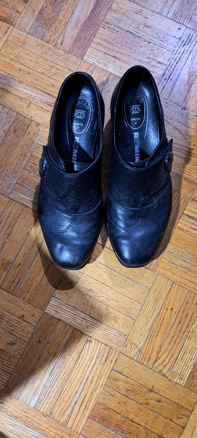 Pair of black leather women's shoes. Low block heel. Slip-on style with single strap and button closure. Some wear and tear visible. Haven't worn in a long time.. I can only wear flats now Cash only pick up only