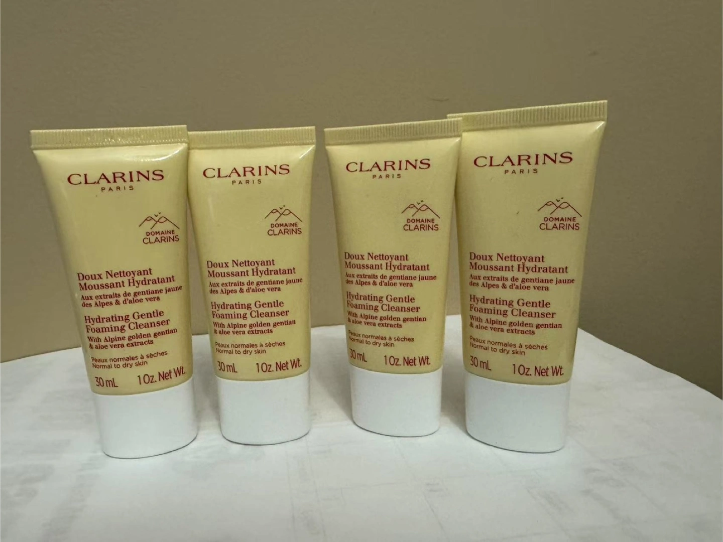 Four travel-sized tubes of Clarins Hydrating Gentle Foaming Cleanser. Suitable for normal to dry skin. Alpine golden gentian and aloe vera extracts. $7each ,$26/4 .