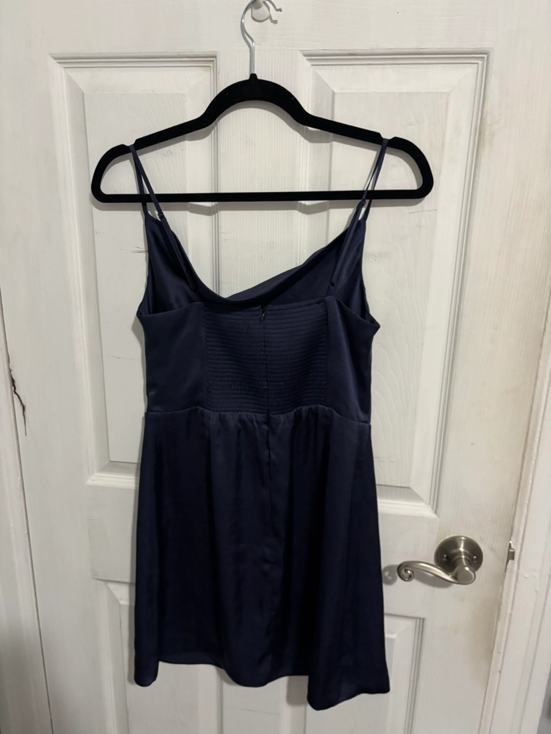 73Beautiful navy blue mini dress. Features a cowl neck and adjustable straps. A-line silhouette. Perfect for a night out.