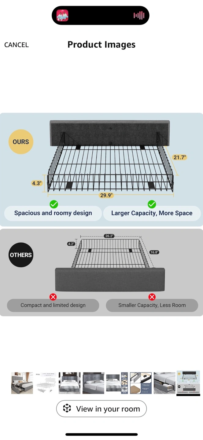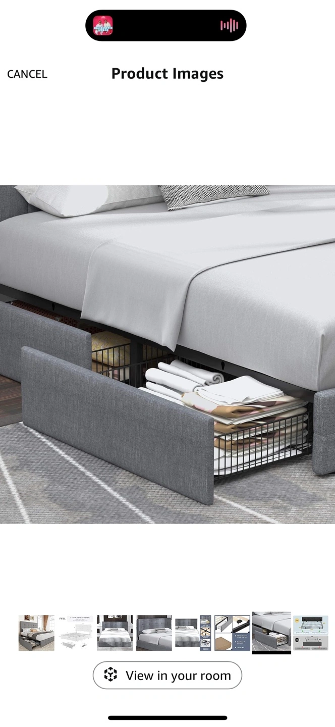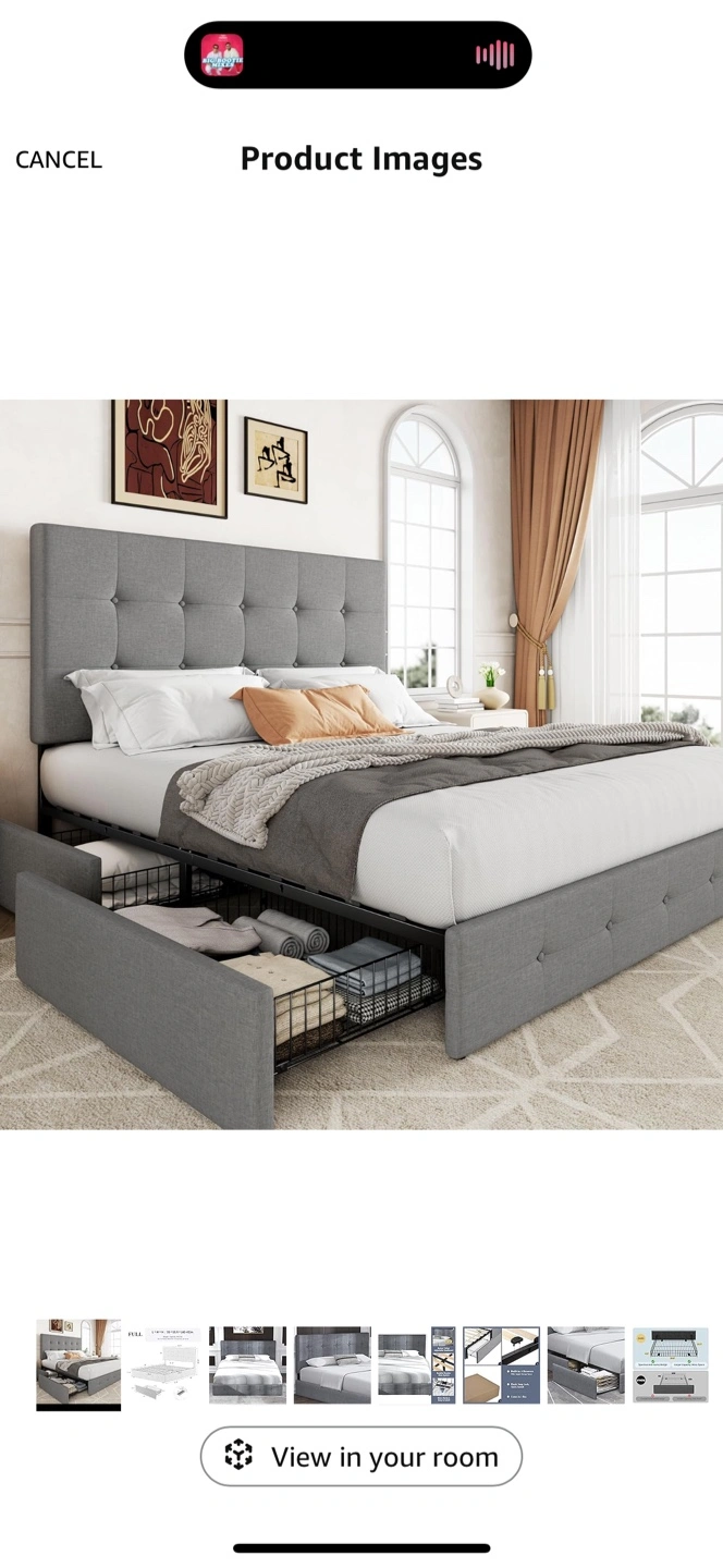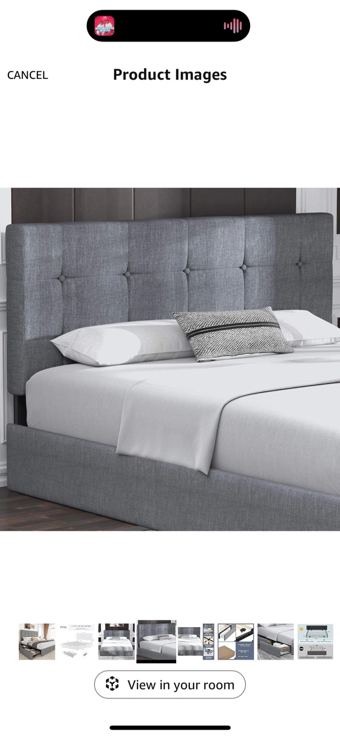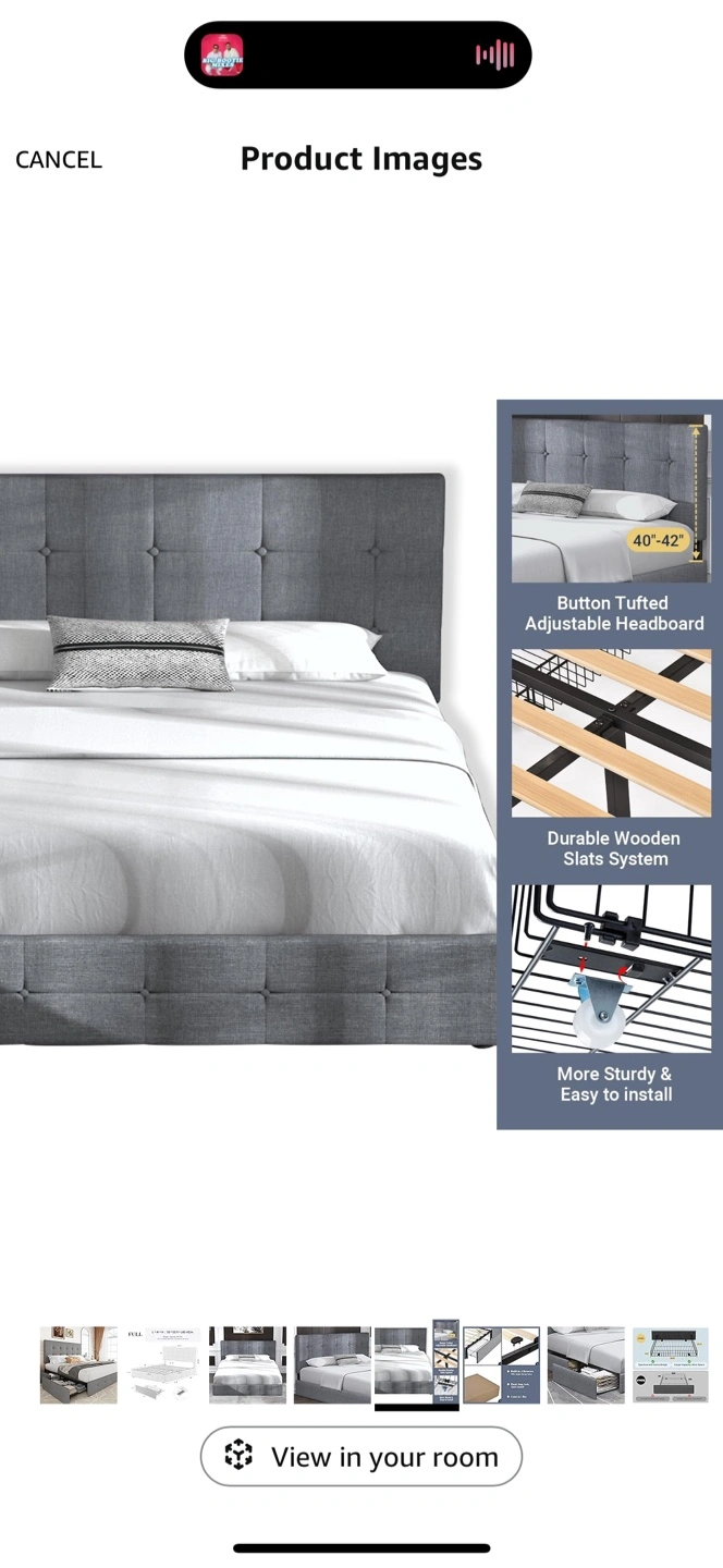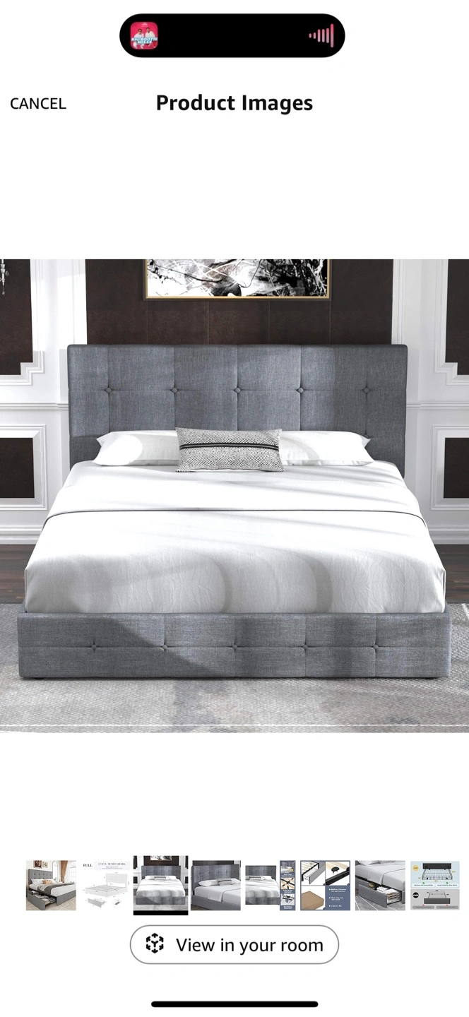 Full size bed frame. Gray fabric upholstery. Button tufted headboard. Includes two pull-out drawers for storage. Sturdy wooden slats. Easy to assemble.
