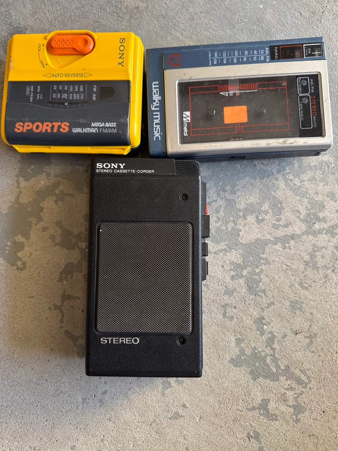 121Collection of three vintage cassette players. Includes a yellow Sony Sports Walkman with FM/AM radio, a Walky Music player, and a black Sony Stereo Cassette-corder. Great for collectors or music lovers.