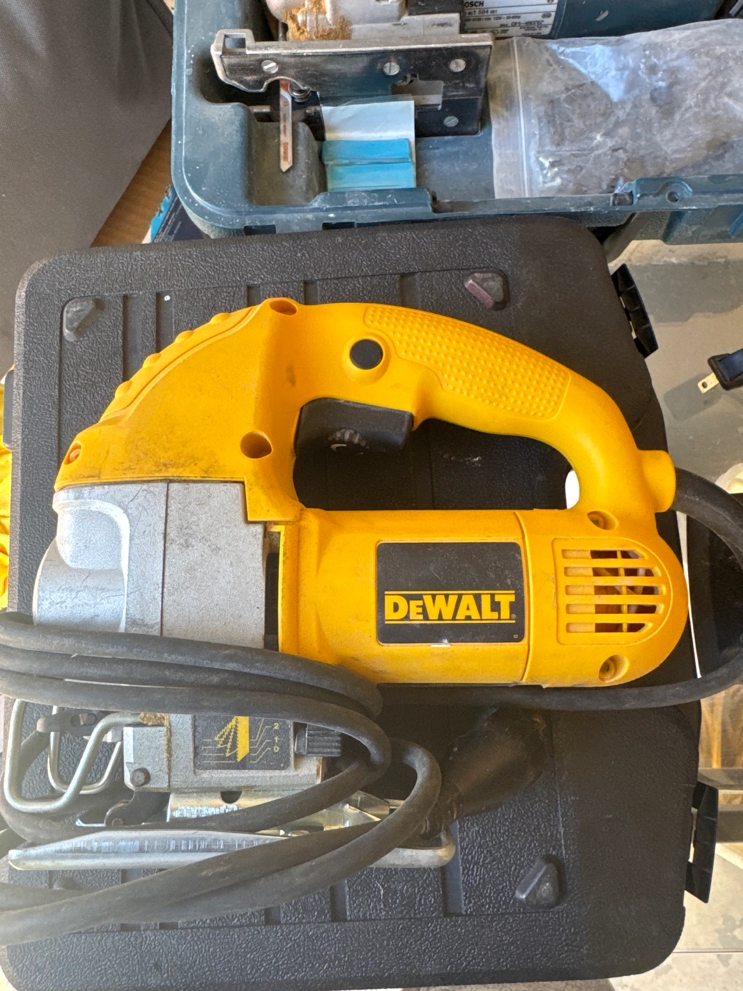 121Used Dewalt jigsaw. Cordless. Yellow and grey. Includes power cord.
