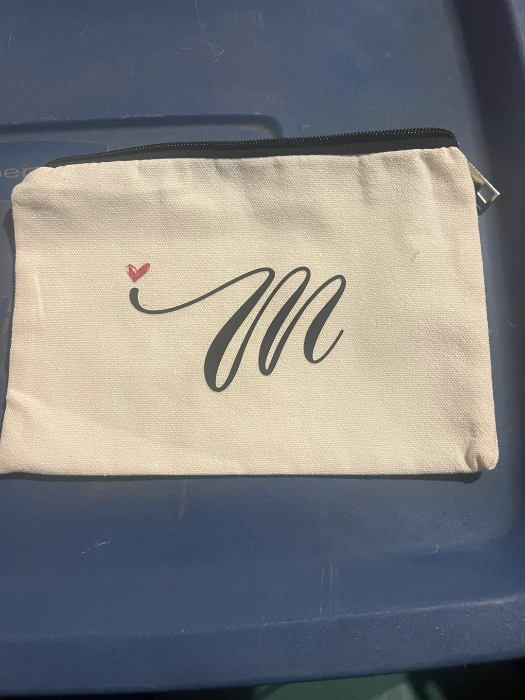 This cream canvas pouch features a stylish black cursive "M" with a small red heart accent. It's perfect for storing makeup, pens, or small essentials. The interior lining appears to be a light beige fabric.