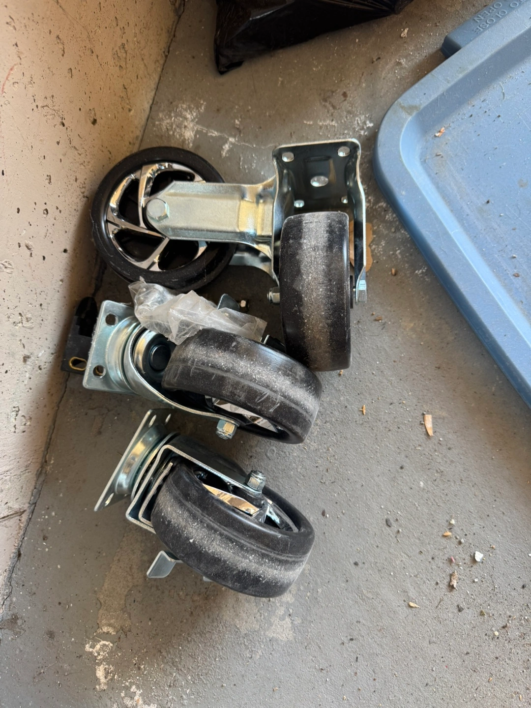 121Four used heavy-duty casters. Metal swivel brackets. Black rubber wheels. Show some wear.