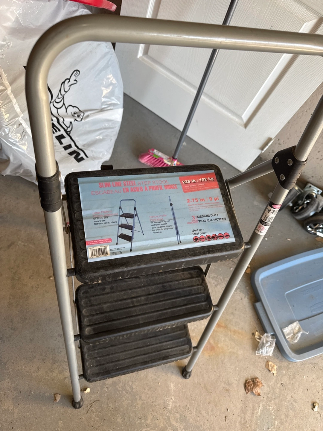 121Portable step stool. Compact design. Three steps. Durable steel construction. Supports up to 225 lbs.