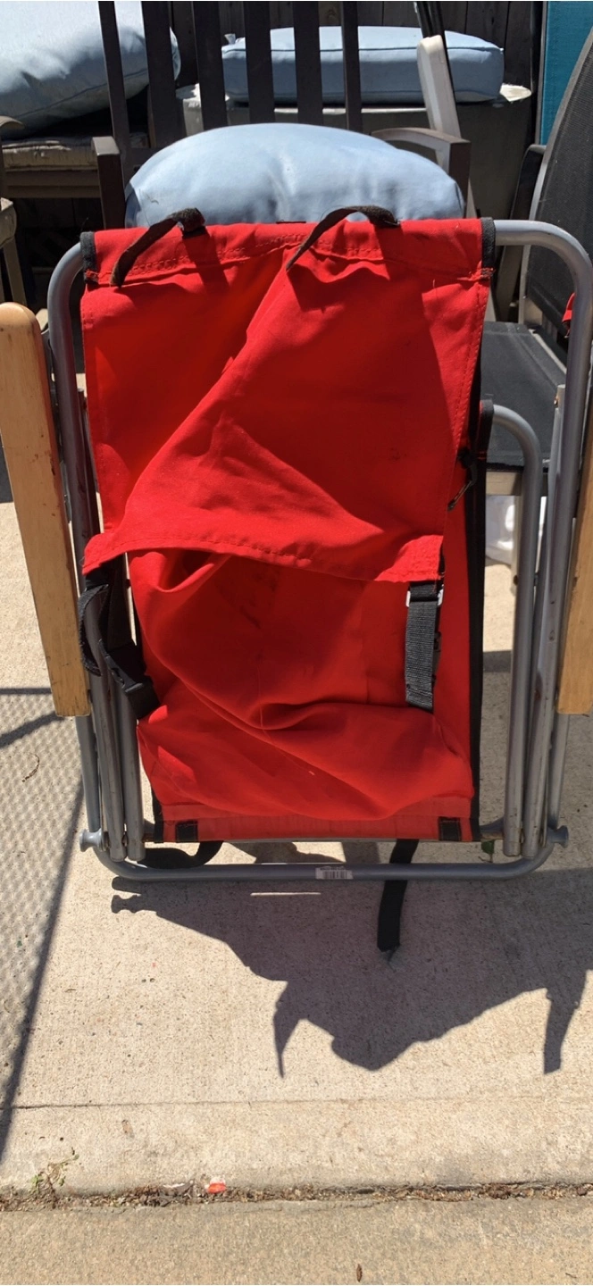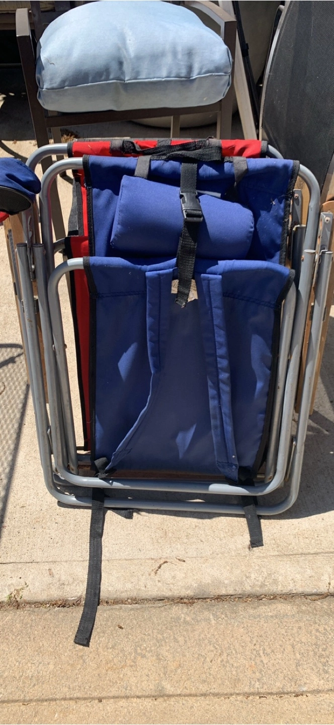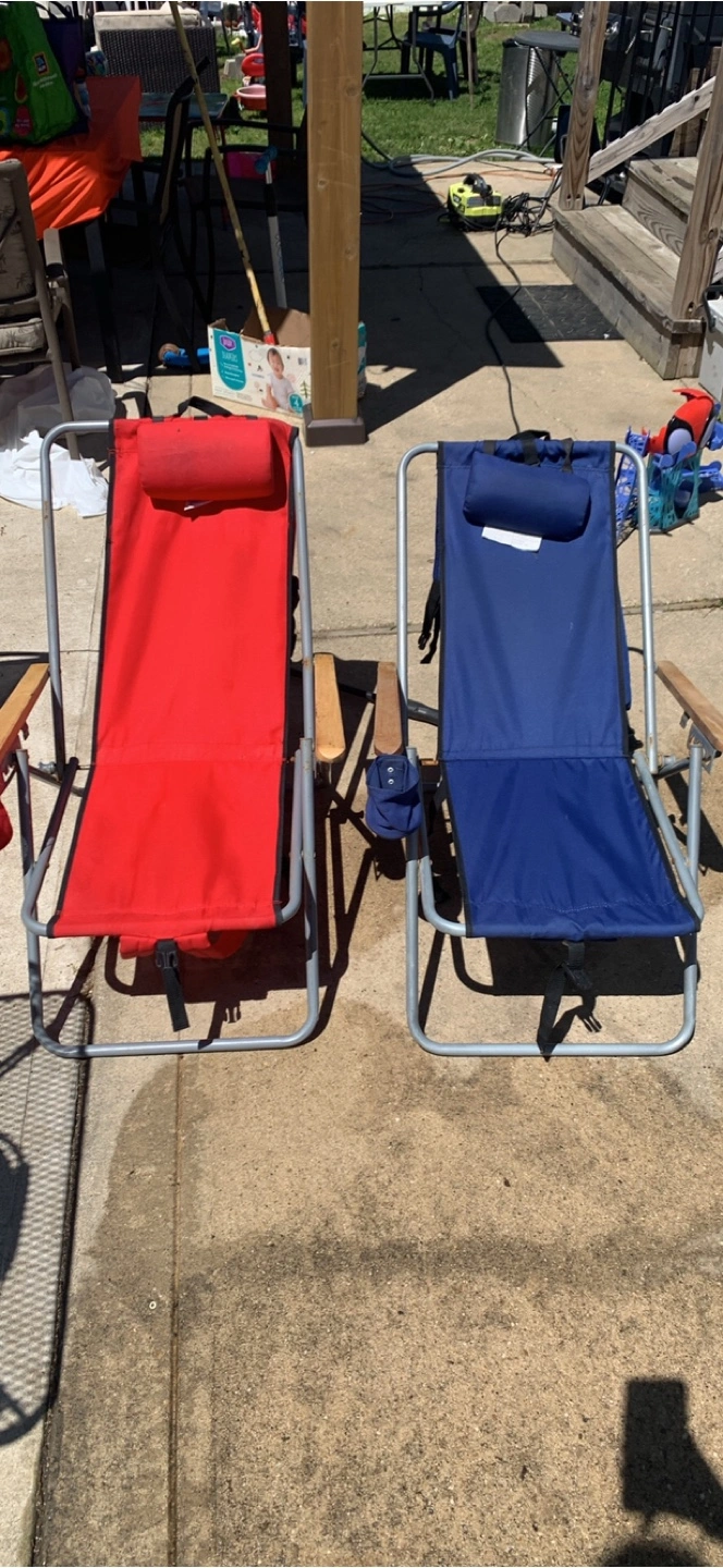 Two folding backpack chairs. One red, one blue. Carry straps and headrests included. Aluminum frame. Wooden armrests. Great for the beach, camping, or sporting events.