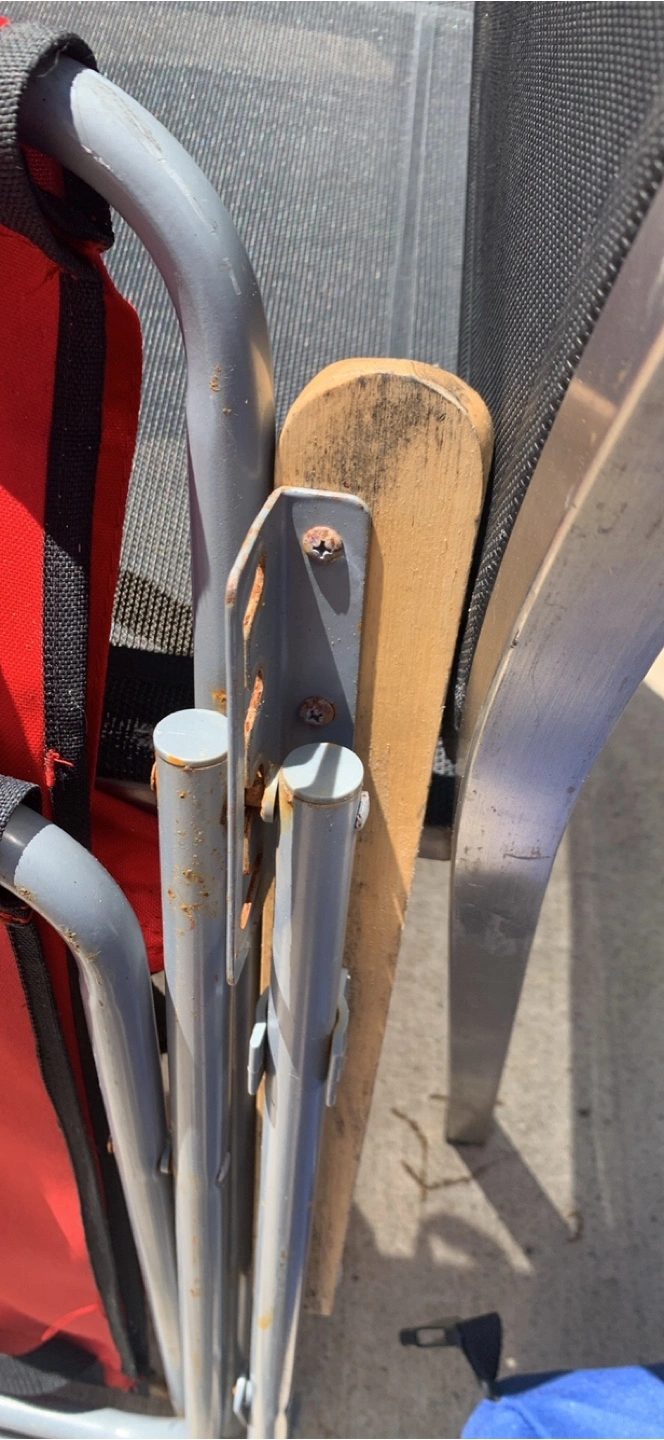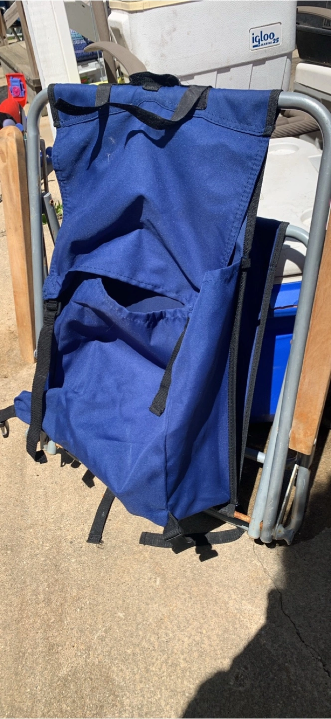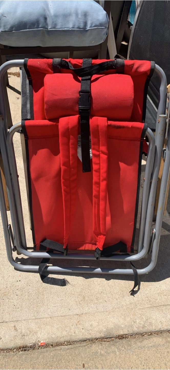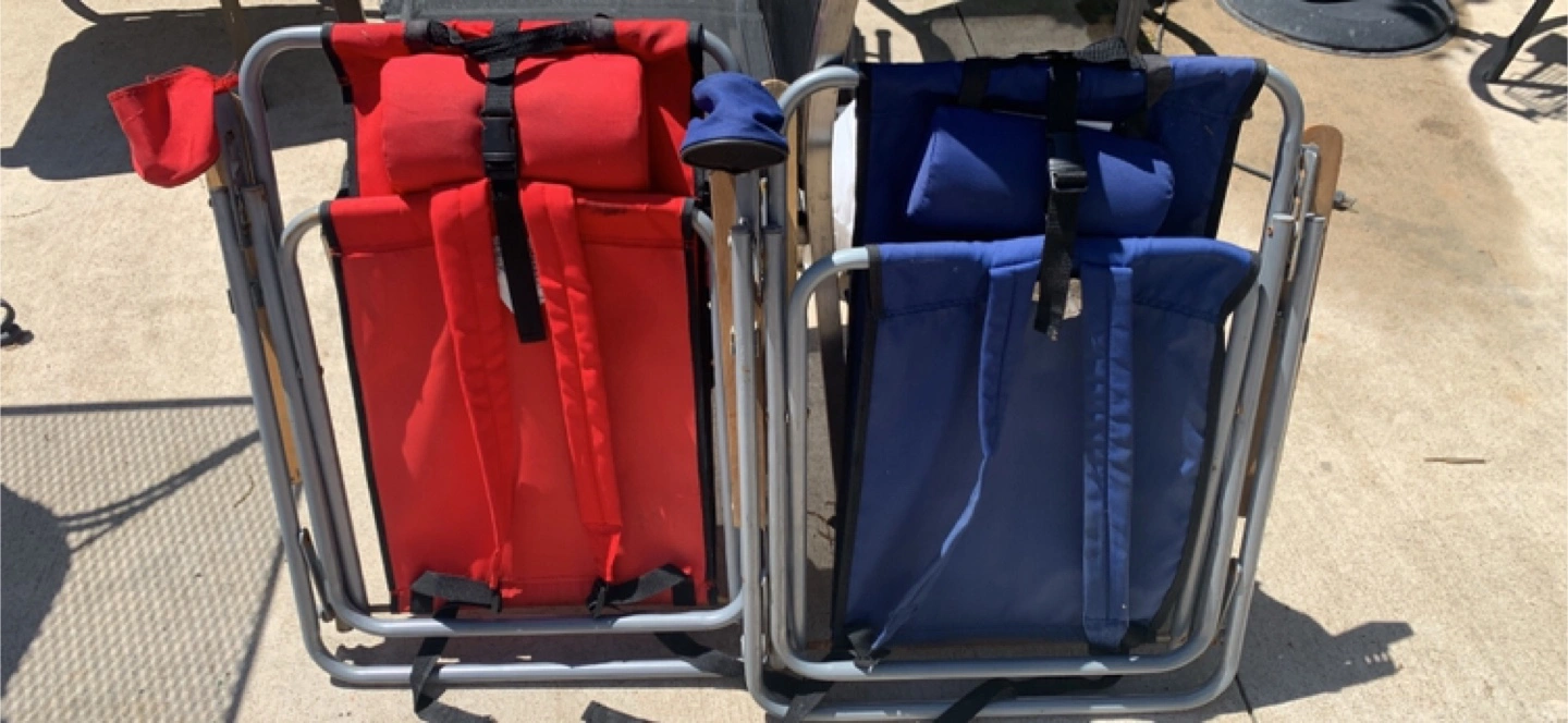 Two folding backpack chairs. One red, one blue. Carry straps and headrests included. Aluminum frame. Wooden armrests. Great for the beach, camping, or sporting events.