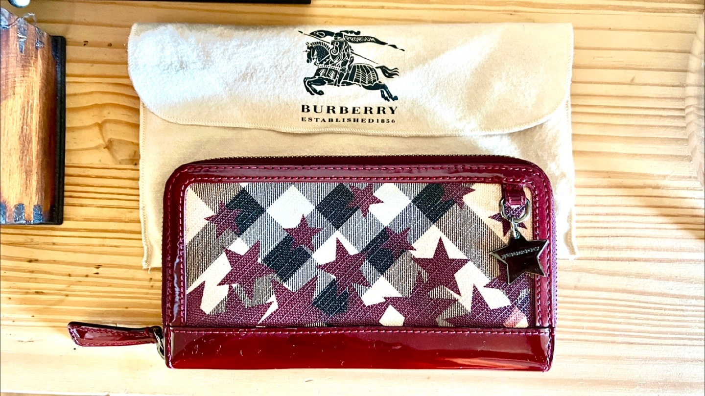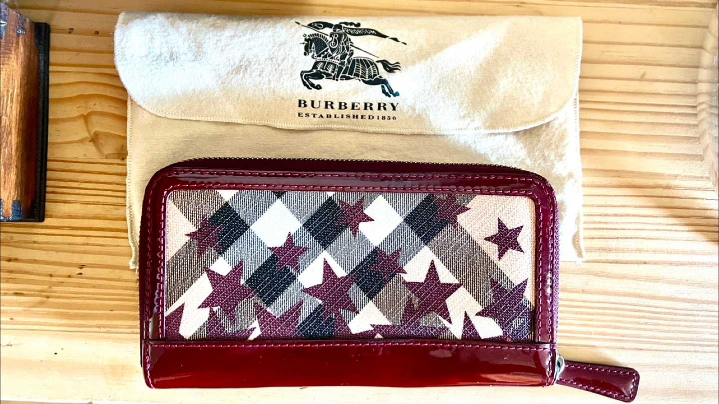 Women's preloved zip around wallet. Burgundy patent leather exterior. Star and check pattern. Interior is burgundy leather, with card slots, slip pockets, bill compartments and zipped pocket. Very good condition. Comes with dust bag.