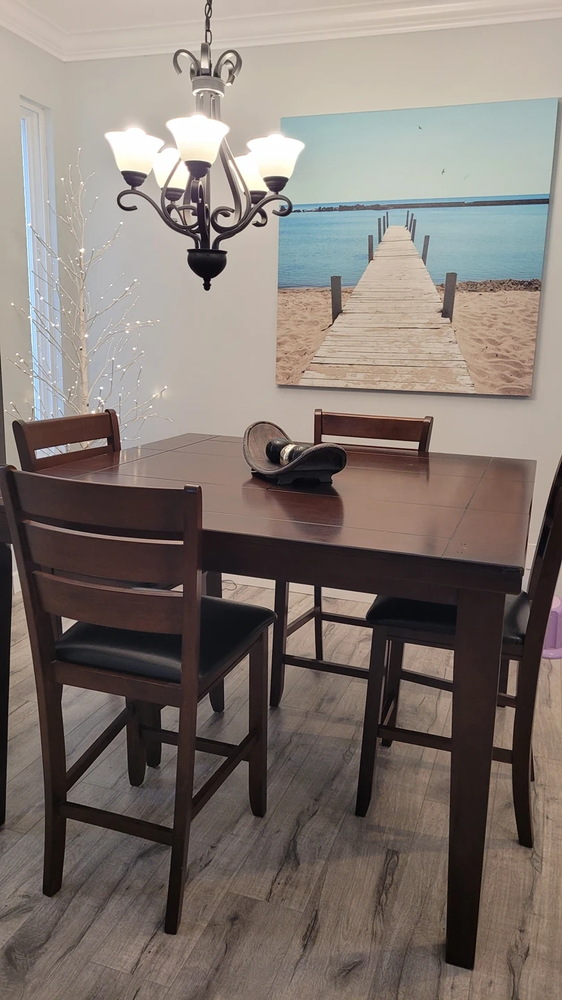 beautiful gently used wood dark cherry 4 chair included dining table and chairs and 1 extension... table seats 6. chairs alone are worth more than n the whole set. wasn't picked up. waited, then kept it. ready to sell again .