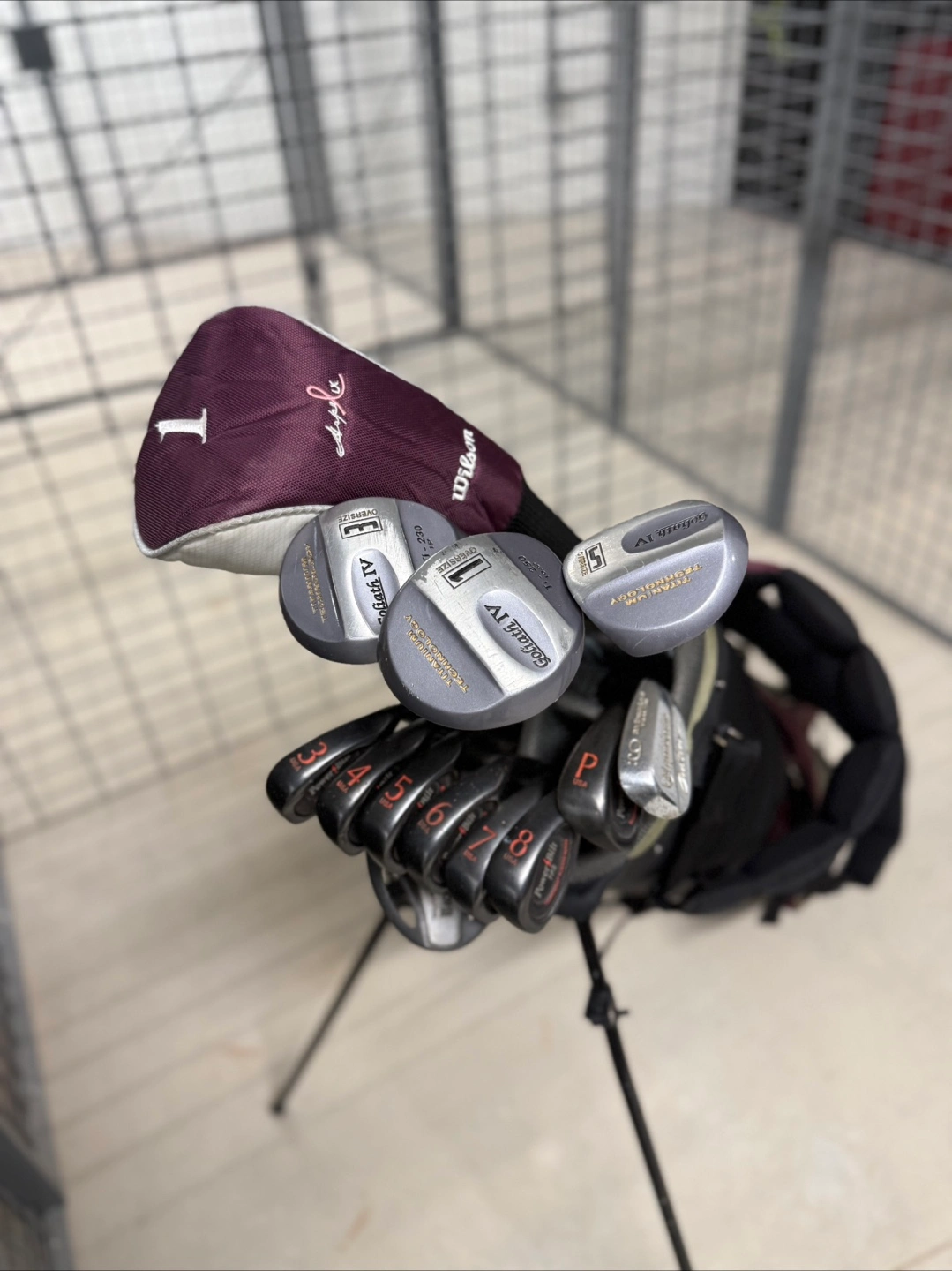 Golf club set. Includes driver, woods, irons, putter, and bag. Good condition. Wilson and Powerbilt brands.