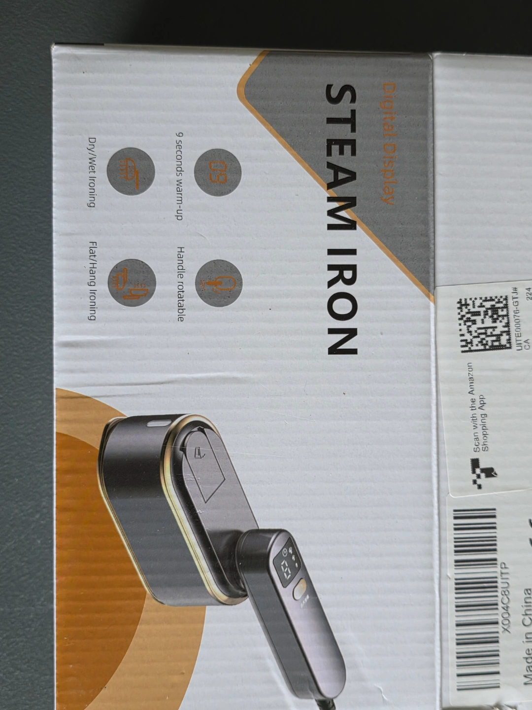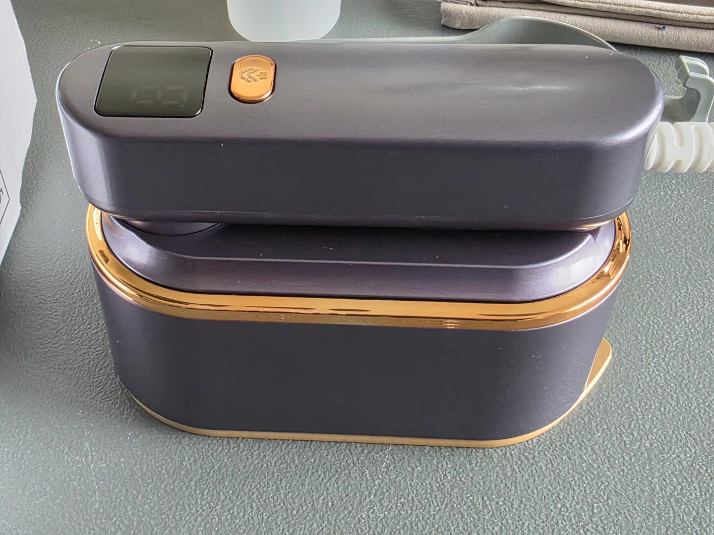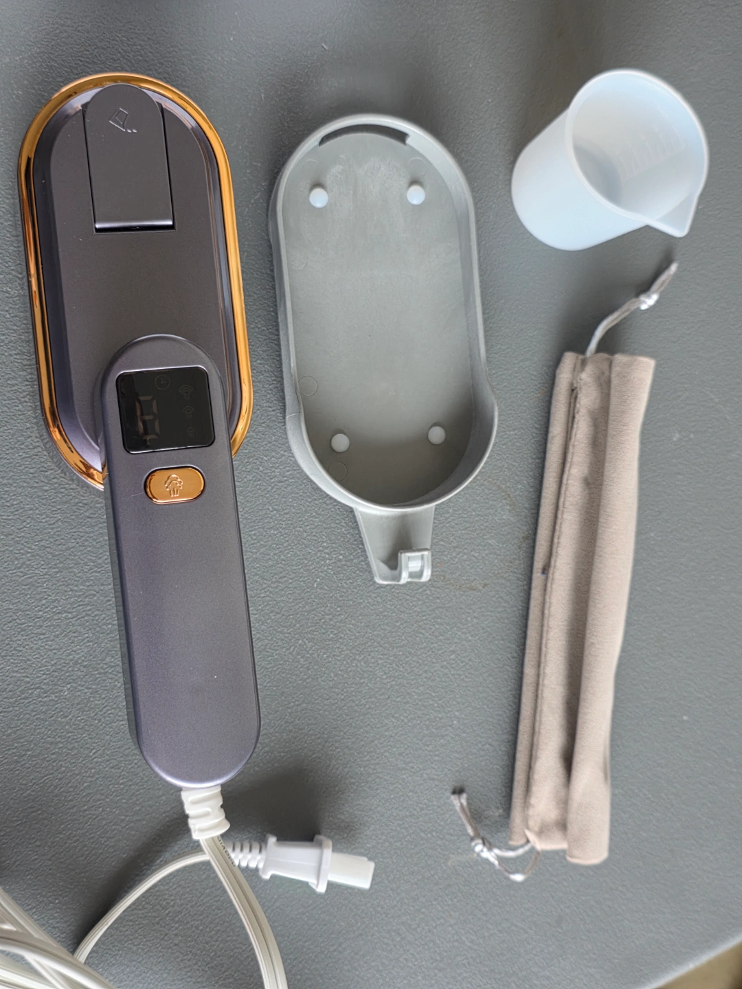 Compact handheld steamer. Digital temperature control. Includes measuring cup and heat-resistant glove. Easy to use.