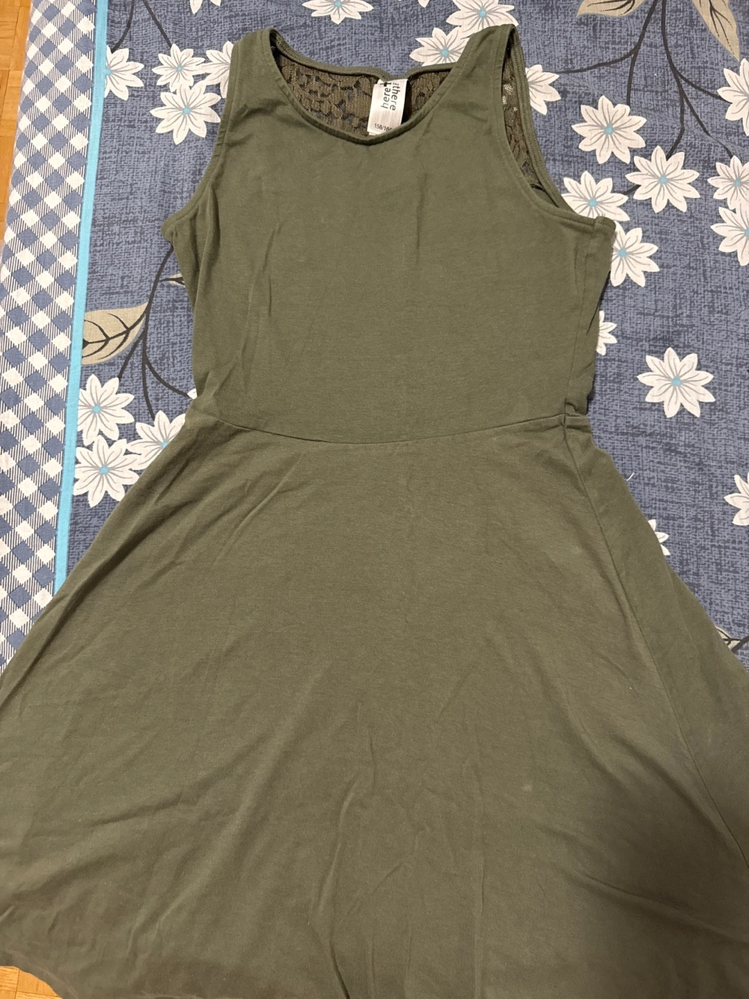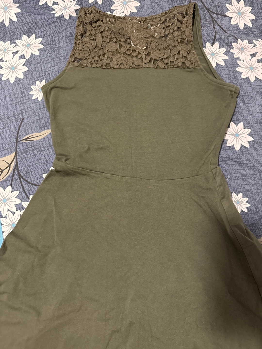 Cute olive green skater dress. Features a lace back design. Simple and stylish.