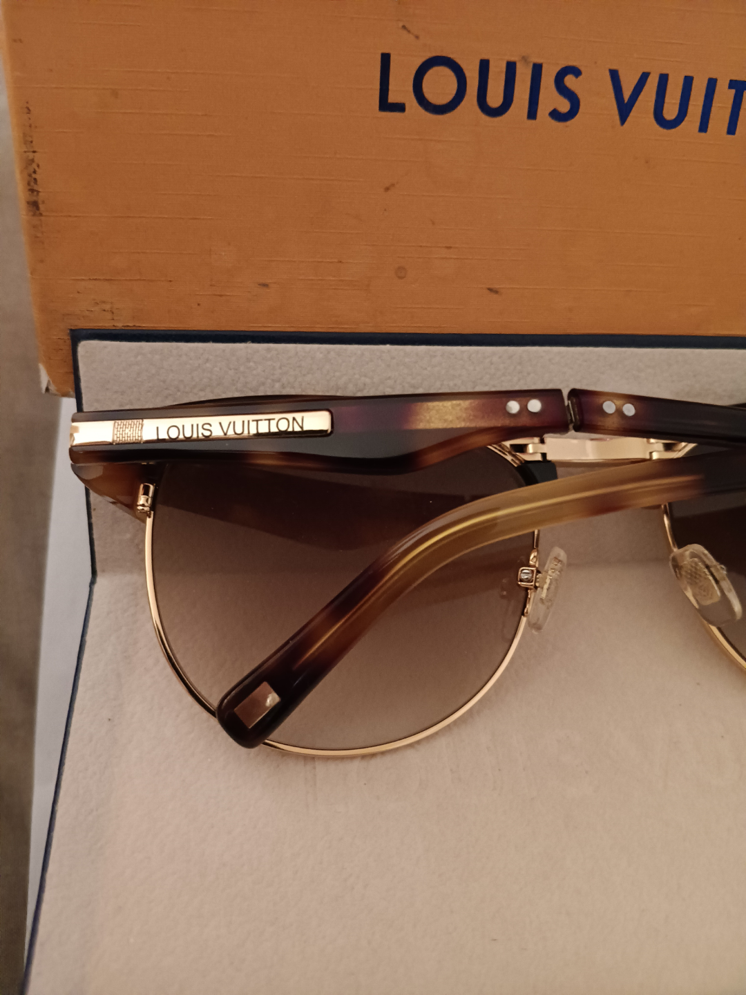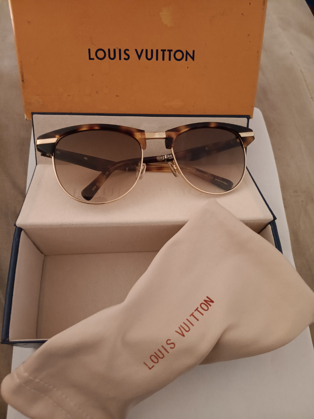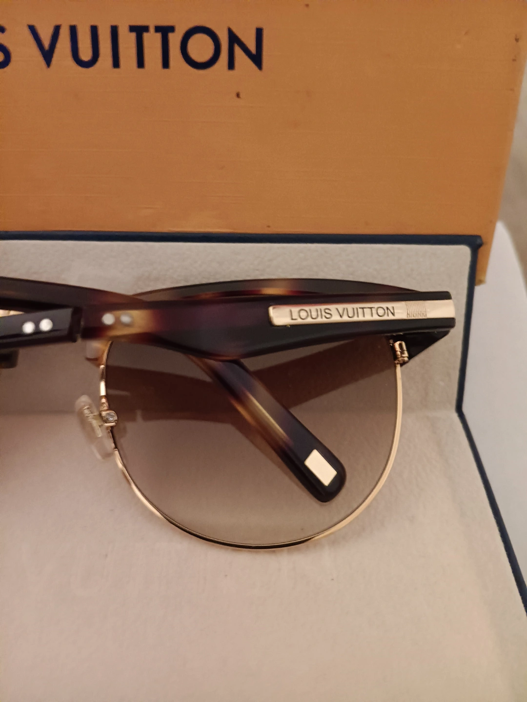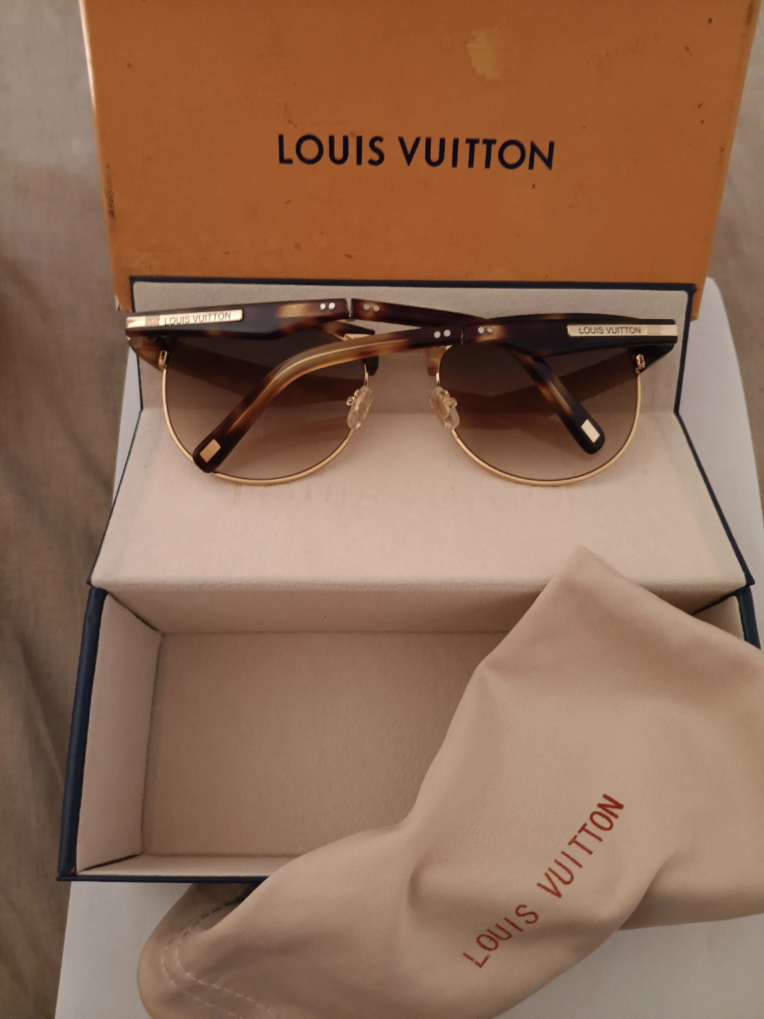 Authentic Louis Vuitton sunglasses. Brown tortoiseshell frames, gold accents. Comes with original box and case. Excellent condition.