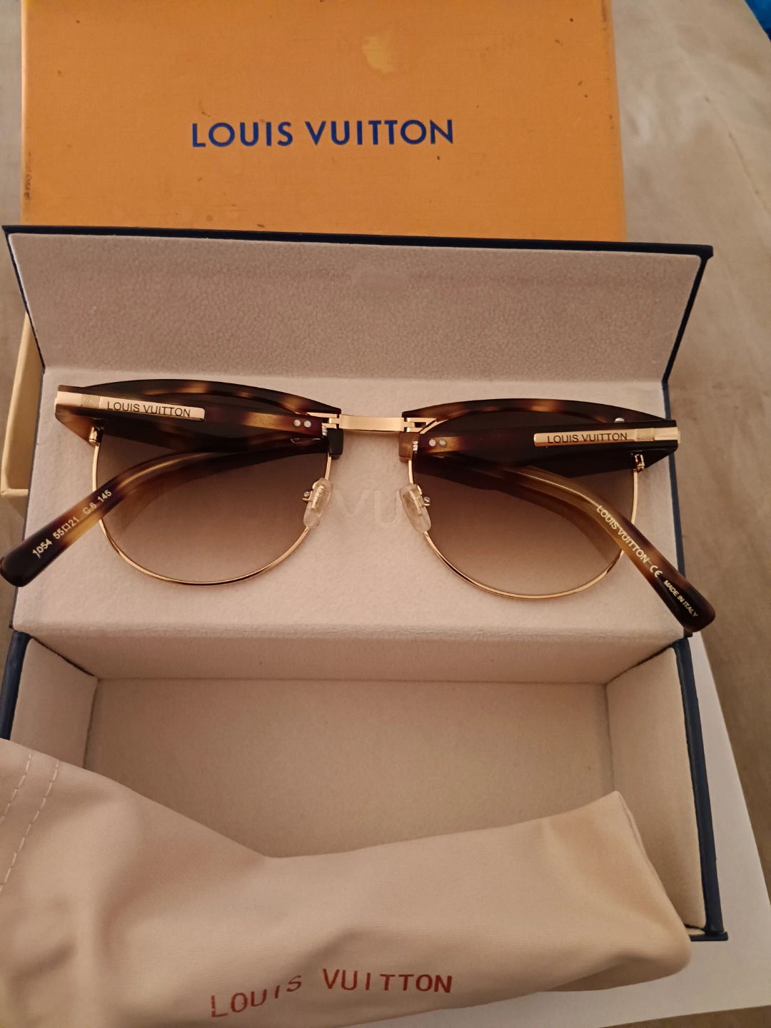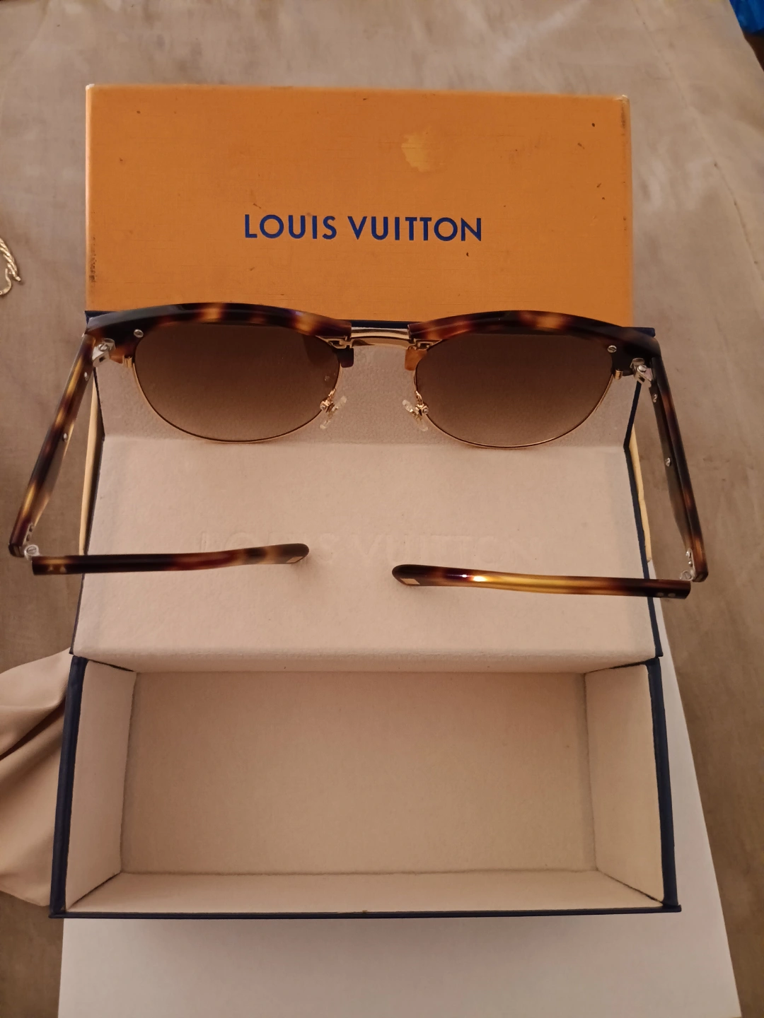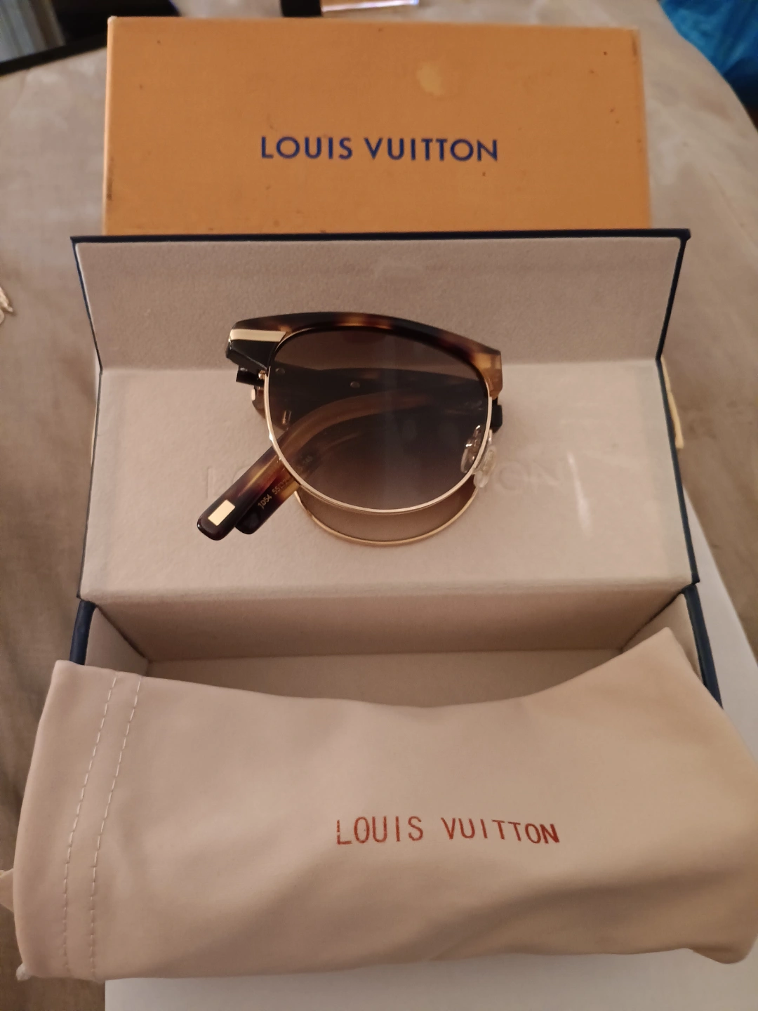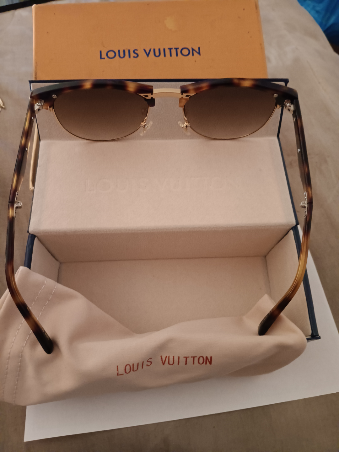 Authentic Louis Vuitton sunglasses. Brown tortoiseshell frames, gold accents. Comes with original box and case. Excellent condition.