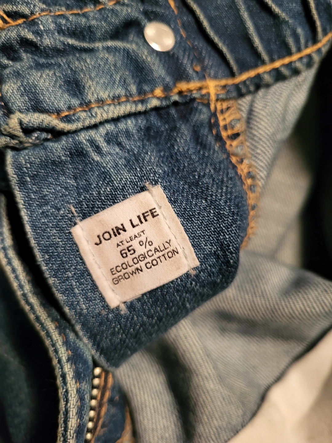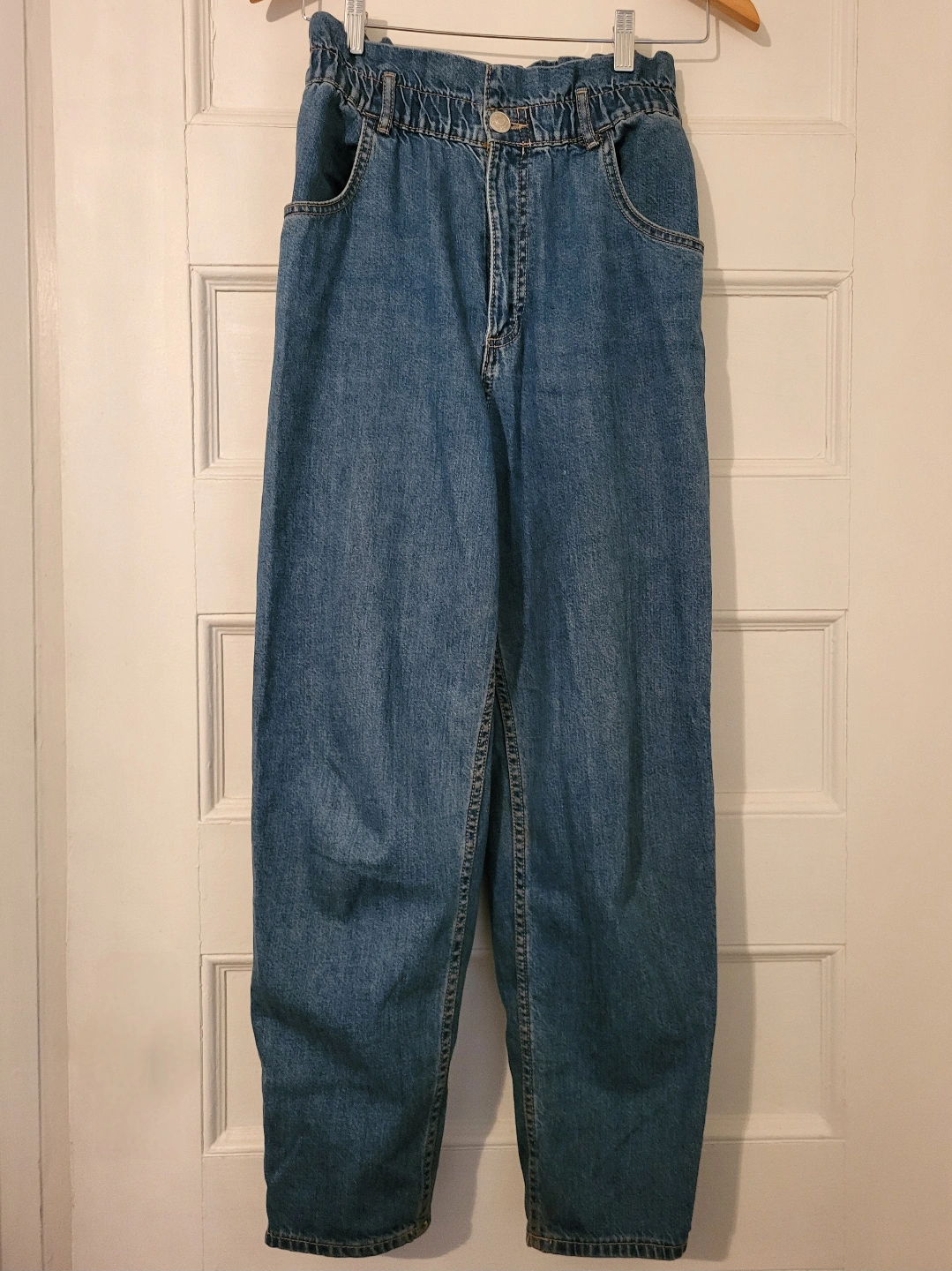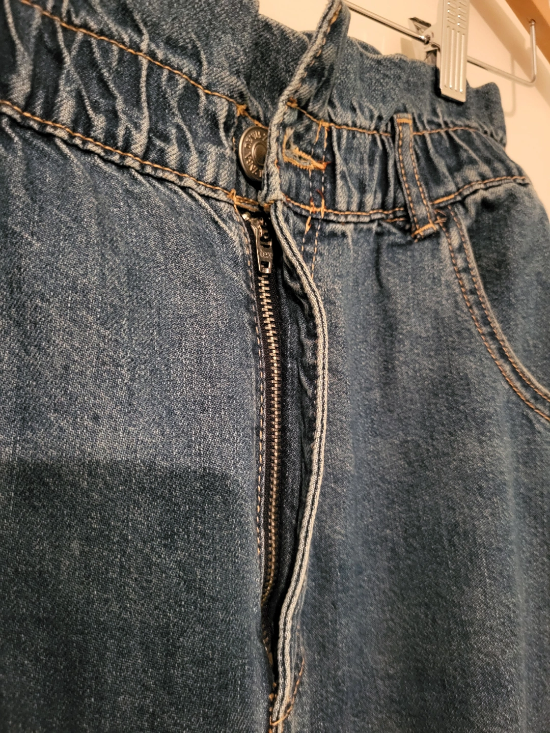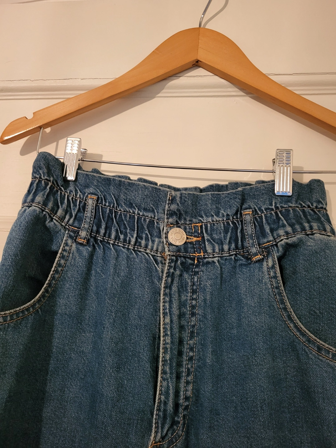 Extremely comfortable. Paperbag waist detail. Button and zip closure. Front and back pockets. Medium wash denim.