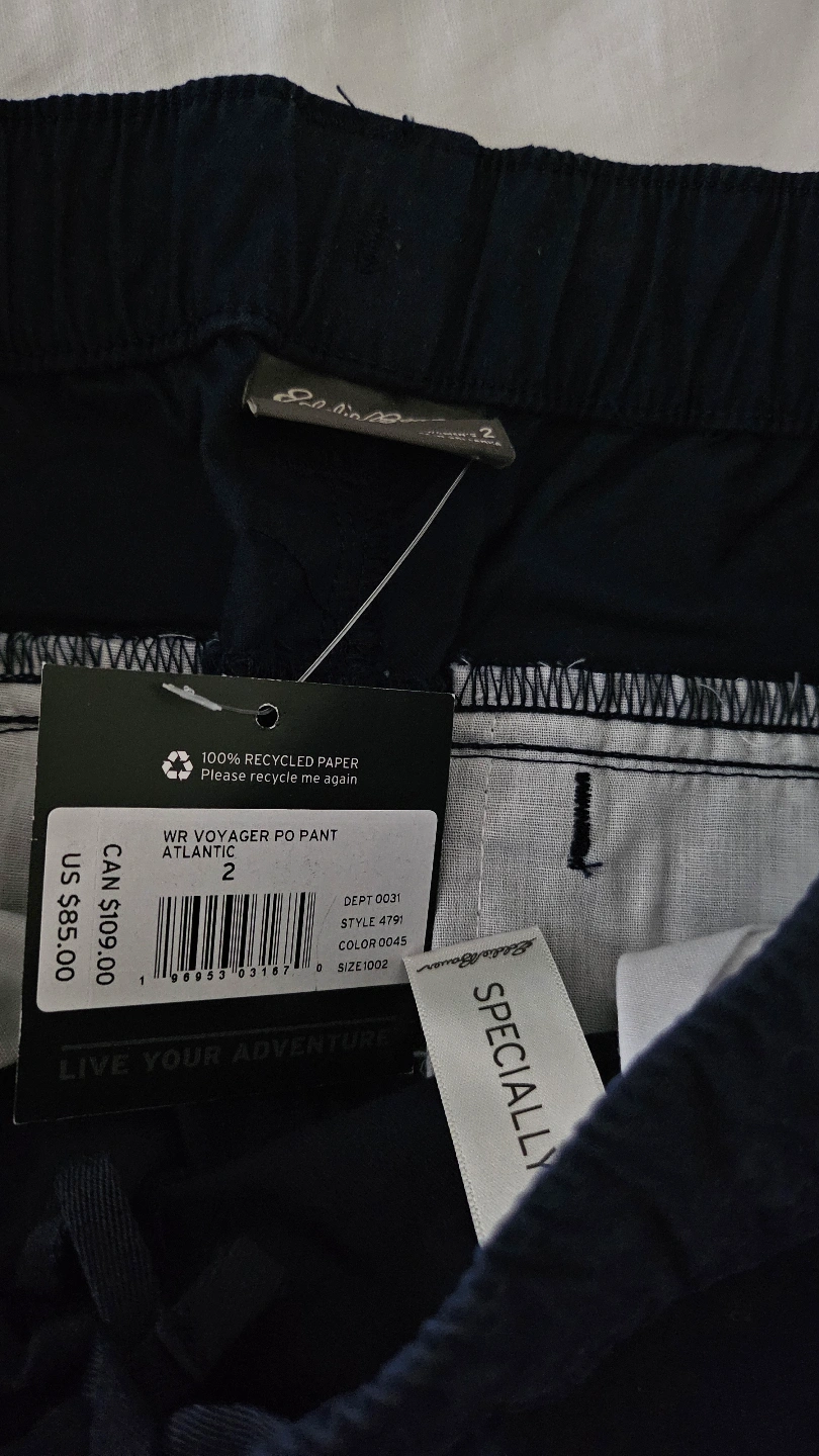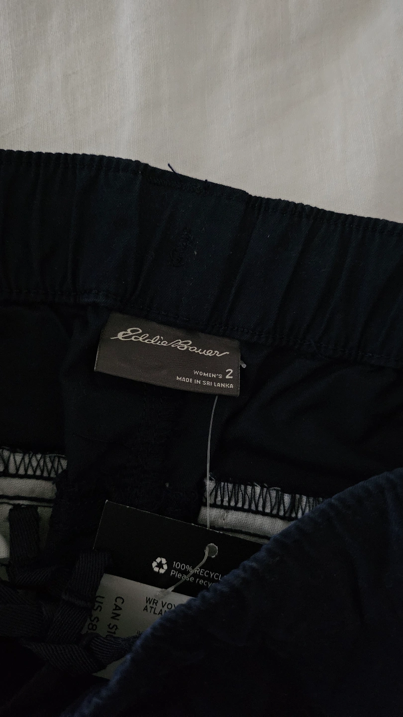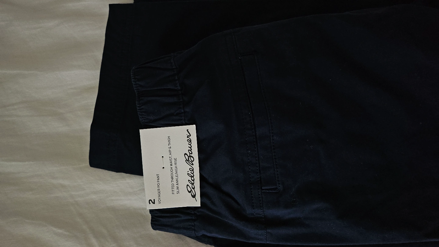 32Never worn with tags. Originally 109. Women's size 2 Eddie Bauer Voyager Chino Pant. Dark navy colour. Slim ankle, high rise. Fitted through waist, hip & thigh. Moisture wicking. Quick-drying fabric. Soft cotton, spandex blend.