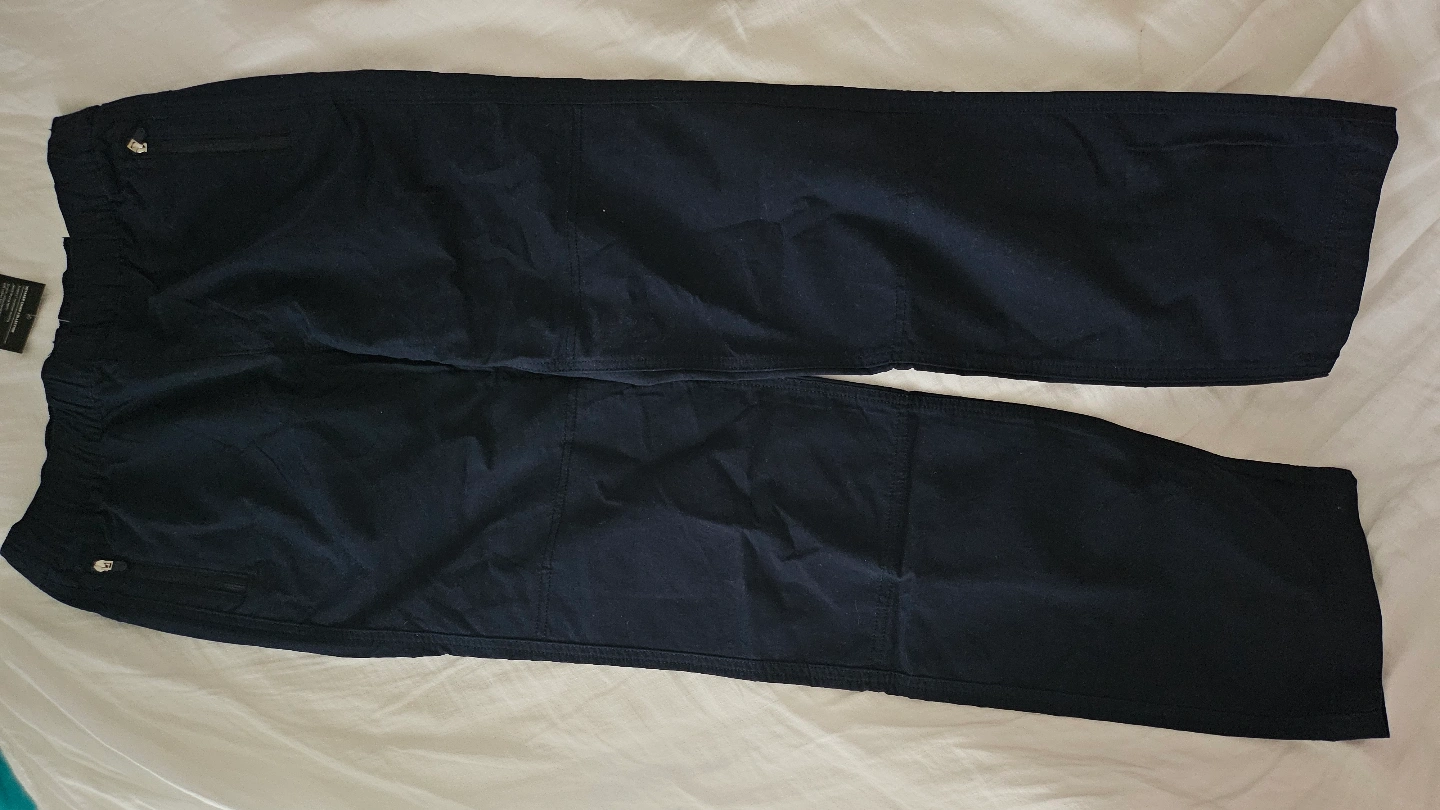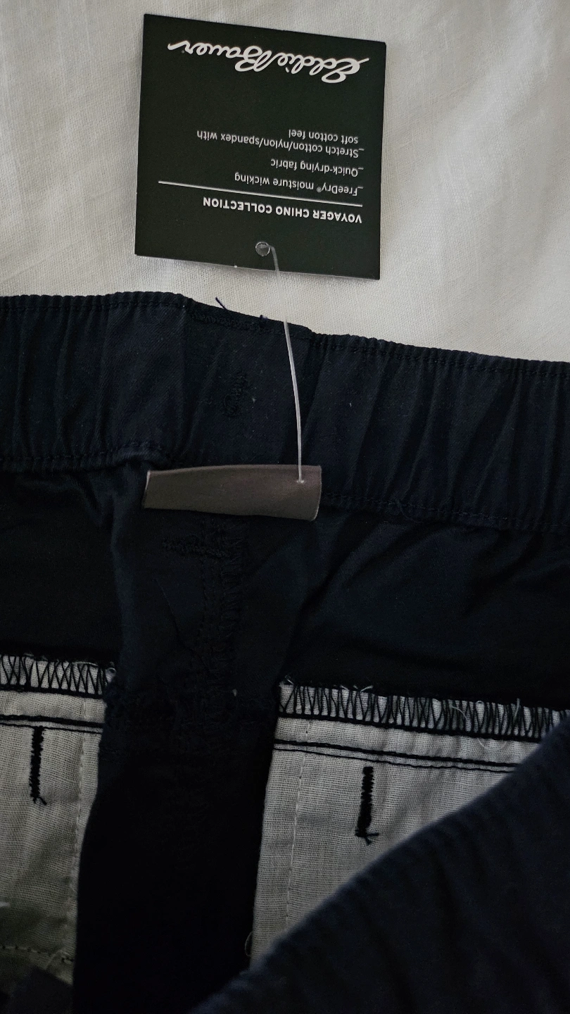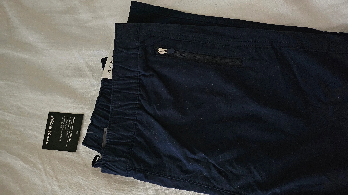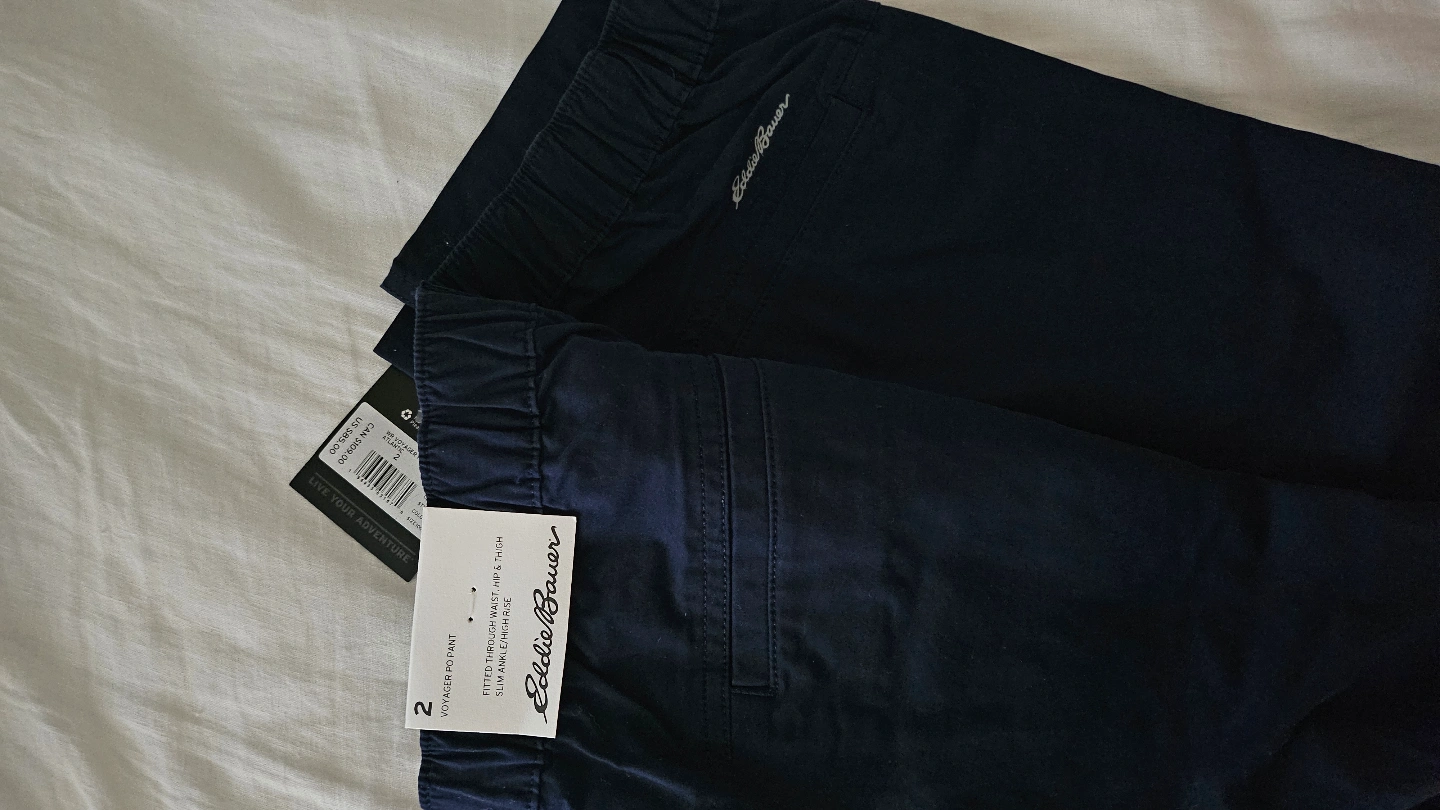 32Never worn with tags. Originally 109. Women's size 2 Eddie Bauer Voyager Chino Pant. Dark navy colour. Slim ankle, high rise. Fitted through waist, hip & thigh. Moisture wicking. Quick-drying fabric. Soft cotton, spandex blend.