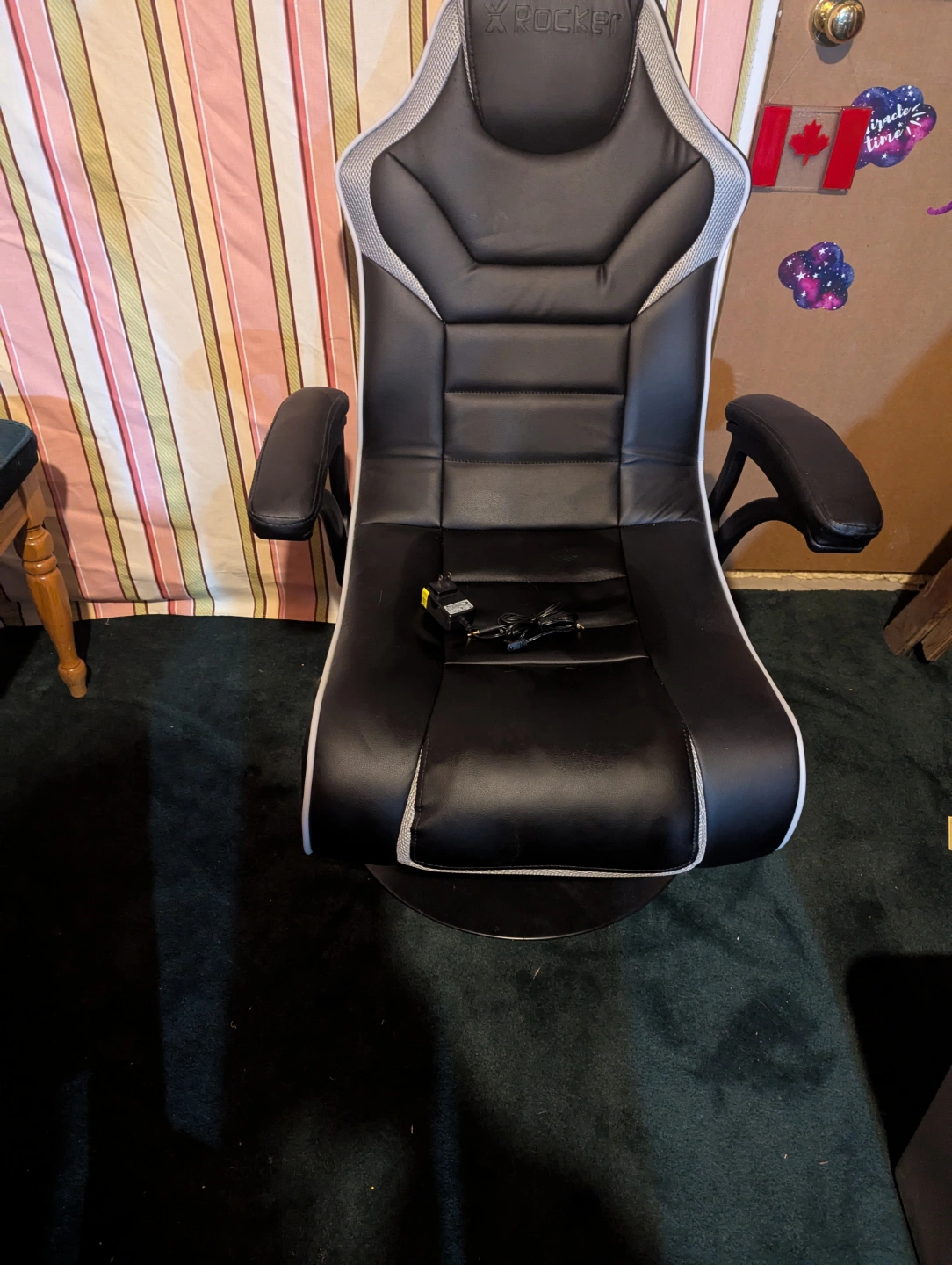 X Rocker Nemesis 2.1 Pedestal Gaming Chair with speaker to sync your gameplay! Folds, power cord included, excellent condition as this has been used very minimally For additional specs info, this was purchased at Canadian tire and the specs are on their website.